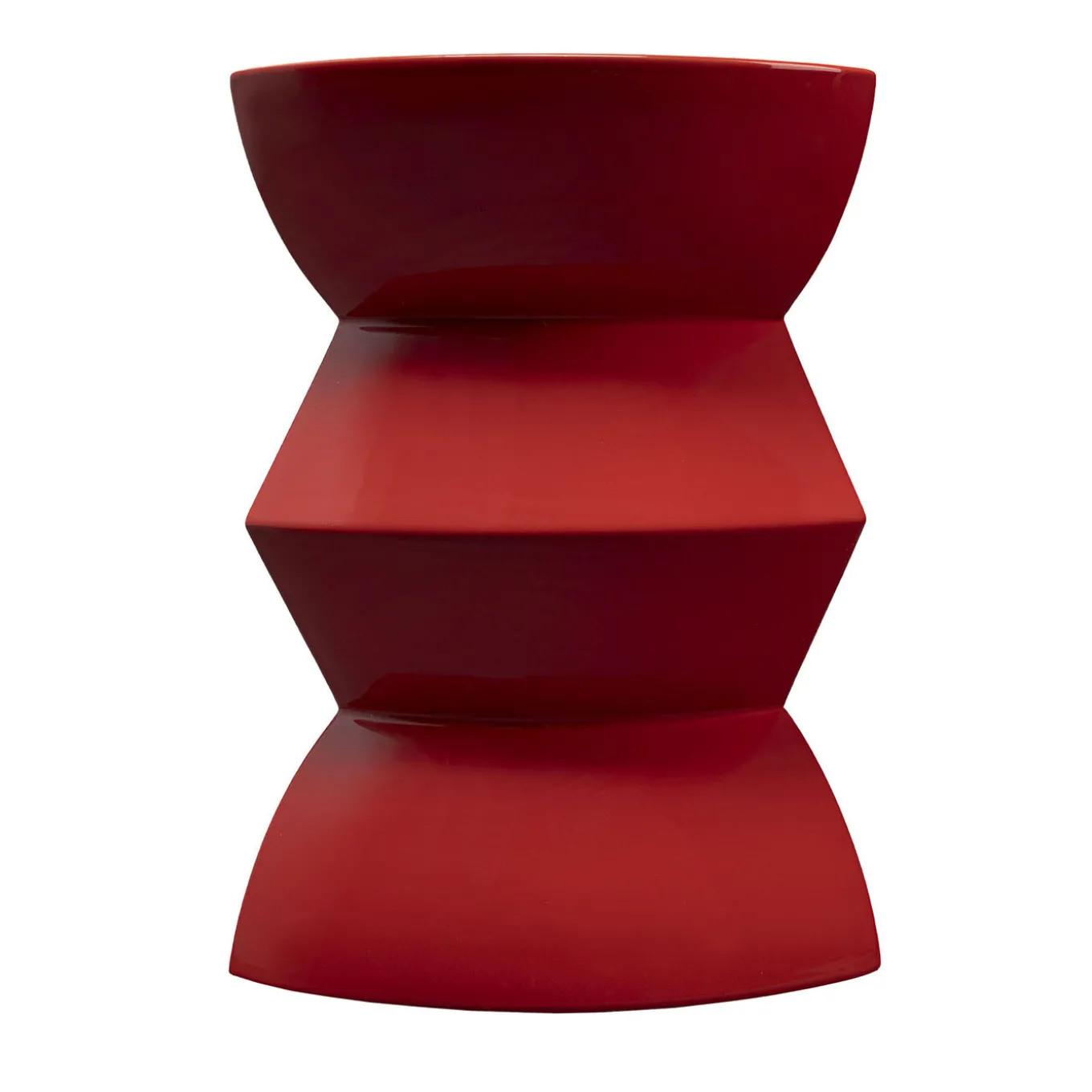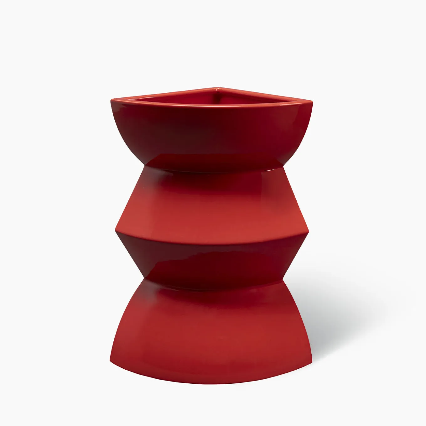 A daring combination of concavities and convexities traces the dynamic profiles of this coral-red ceramic vase, an exclusive piece brimming with sculptural flair. Part of the Curve & Isola Collection, which counts multiple and colorful options, it is characterized by an angular design, suggesting it is ideal for corners or twins to arrange assorted spectacular compositions.