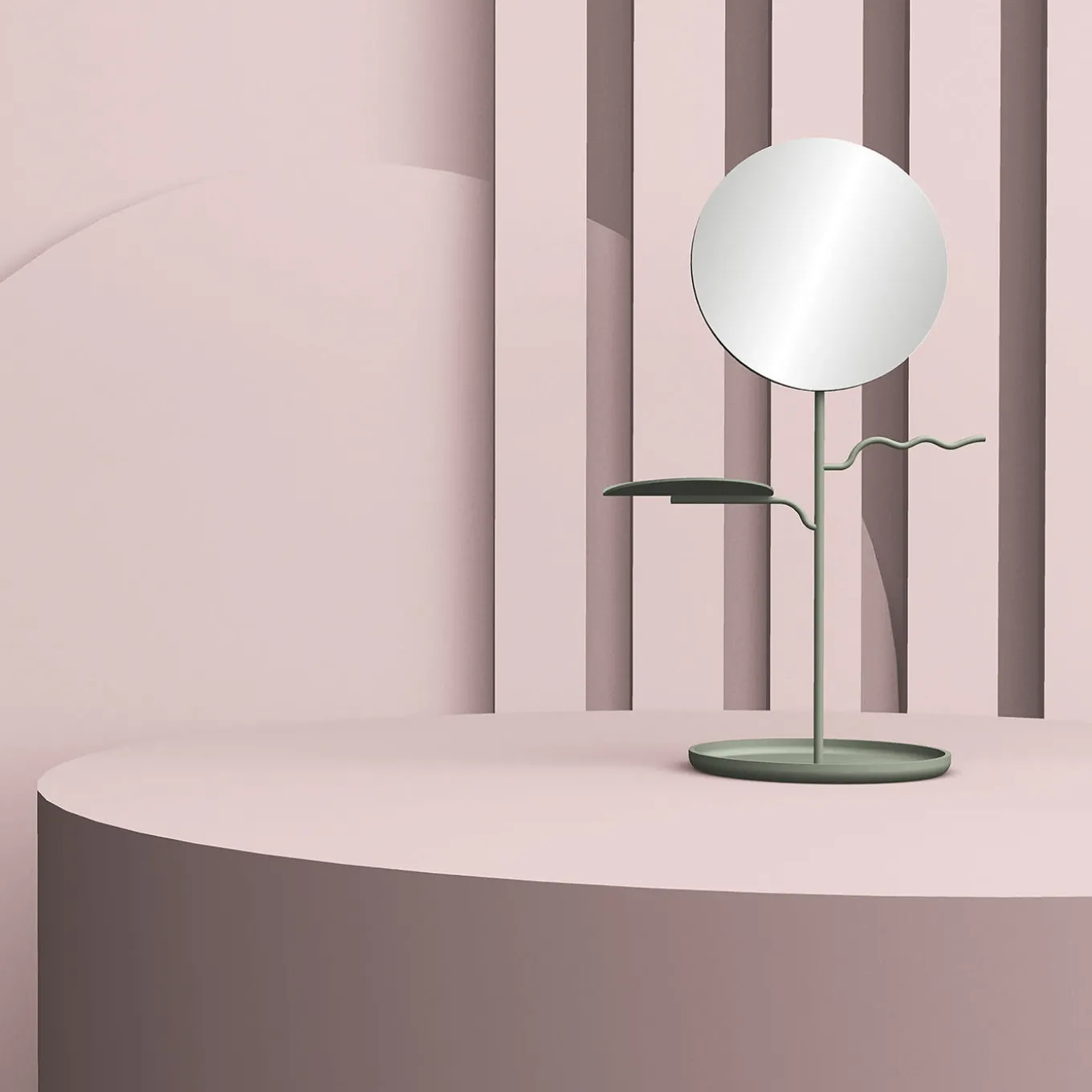 This charming phytomorphic jewelry stand with an incorporated mirror is an innovative design inspired by lotus plants that is sure to uplift any bedroom decor. The anthracite-lacquered iron frame features a round base serving as a tray for watches or bold accessories, from which extends the central stem equipped with a leaf-like shelf and a winding arm where to collect earrings and necklaces in a tangle-proof solution. Available in other colors, please ask the Concierge for options.