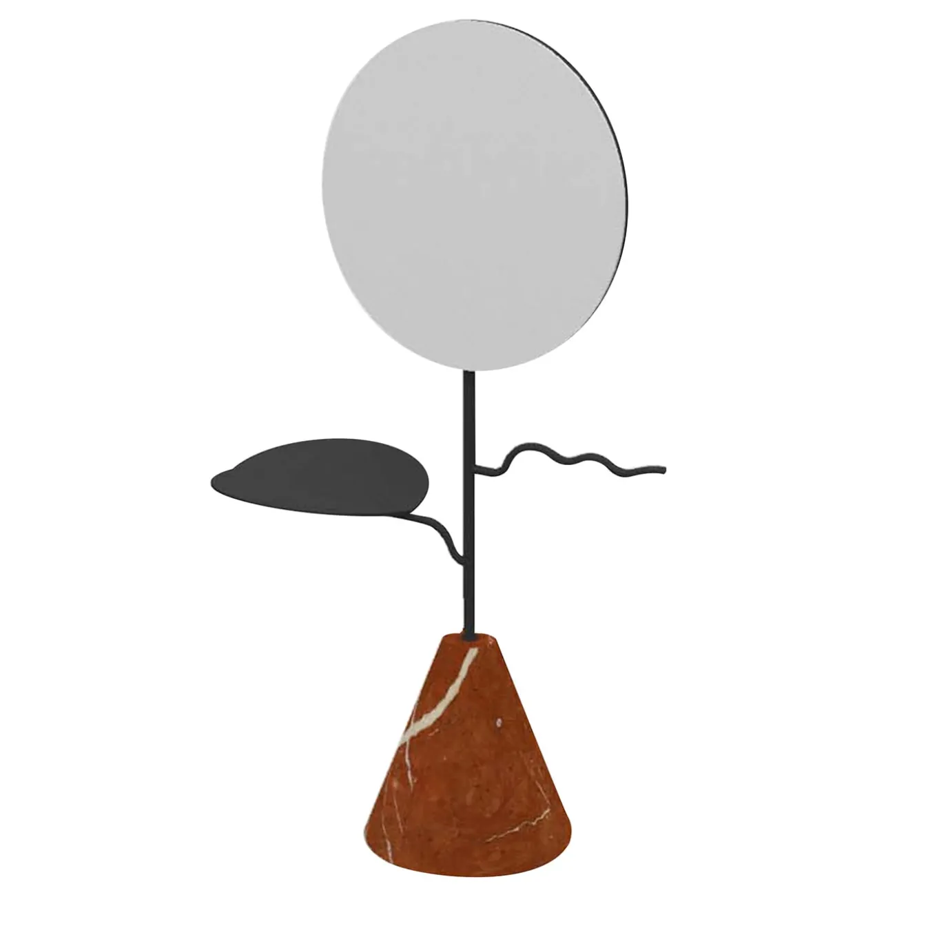 Exclusive design to complement contemporary bedrooms or bathrooms, this jewelry stand owes its captivating design to the plant of lotus, a symbol of enlightenment, purity, and rebirth. The incorporated round mirror allows for quickly glancing at the worn accessories taken from the phytomorphic branches making up the anthracite-lacquered metal frame, which extends from a conical base in Red Alicante marble.