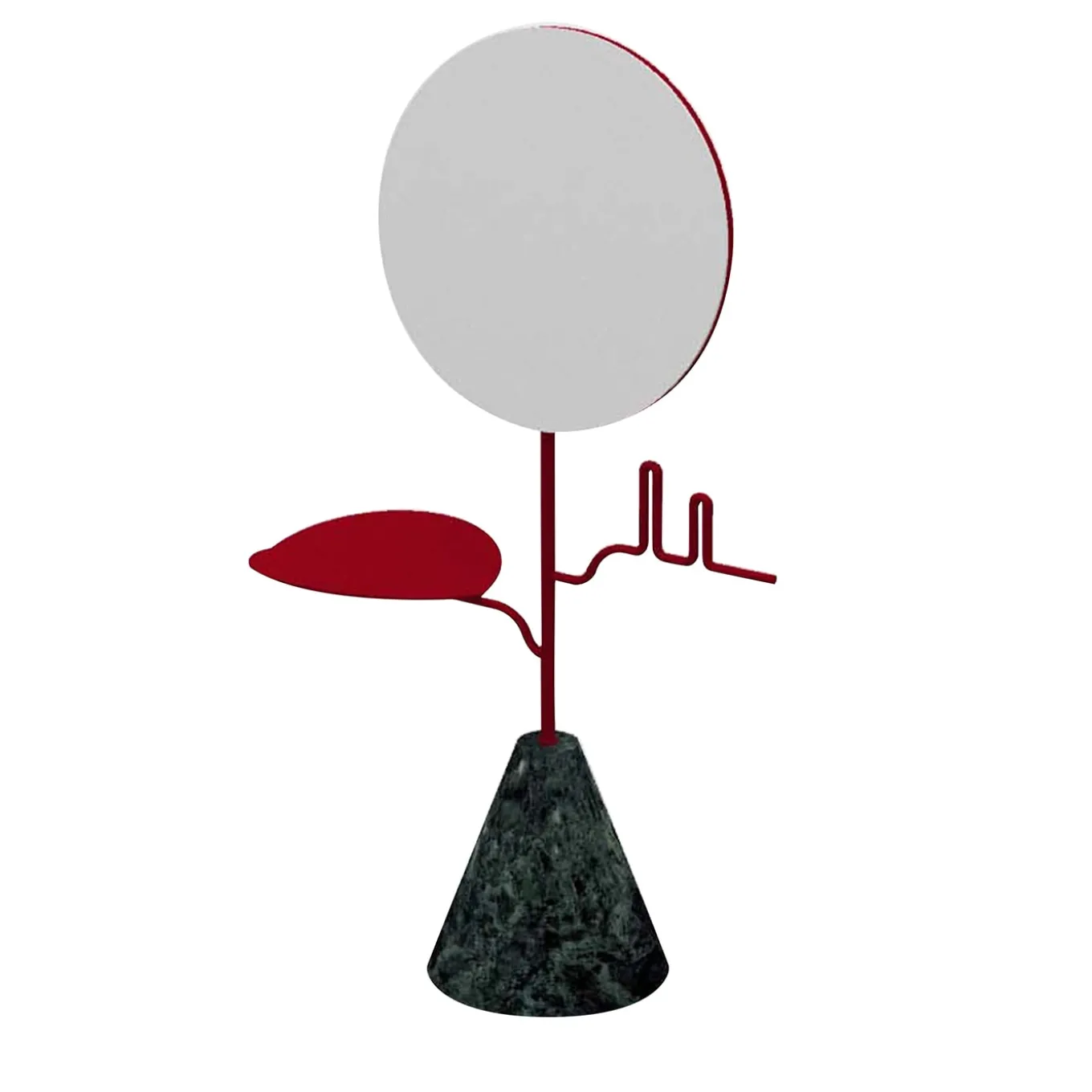 Charming in its functional reinterpretation of the lotus, this jewelry stand with mirror will make an enthralling sculptural statement in a contemporary bedroom, bathroom, or vanity. Fashioned of prized Green Guatemala marble, the conical base firmly supports a ruby-red-lacquered iron frame, consisting of a slim stem with frond-like arms for a collection of bracelets, necklaces, and earrings. Please ask the Concierge for available customization options.