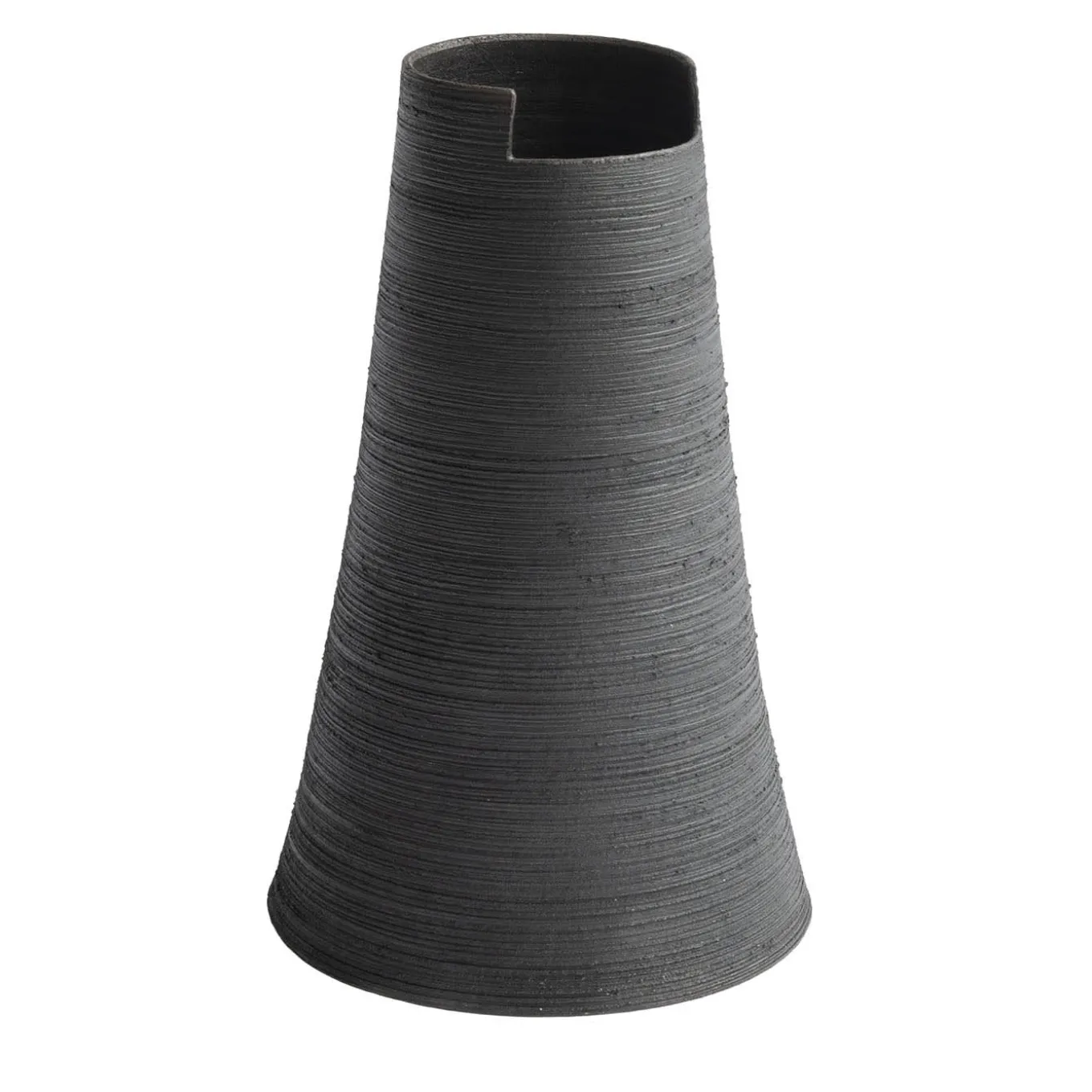 Characterized by precise, sharp cuts directly shaped by the potter’s wheel, this vase embodies minimalist design inspired by Japanese aesthetics and the traditional Raku firing technique. The unique smoked black finish highlights natural cracks and textures formed during the firing process, emphasizing the wabi-sabi ideal of beauty in imperfection. The vase’s textured surface is defined by the interplay of smoke and glaze, offering a striking decorative element for contemporary interiors.