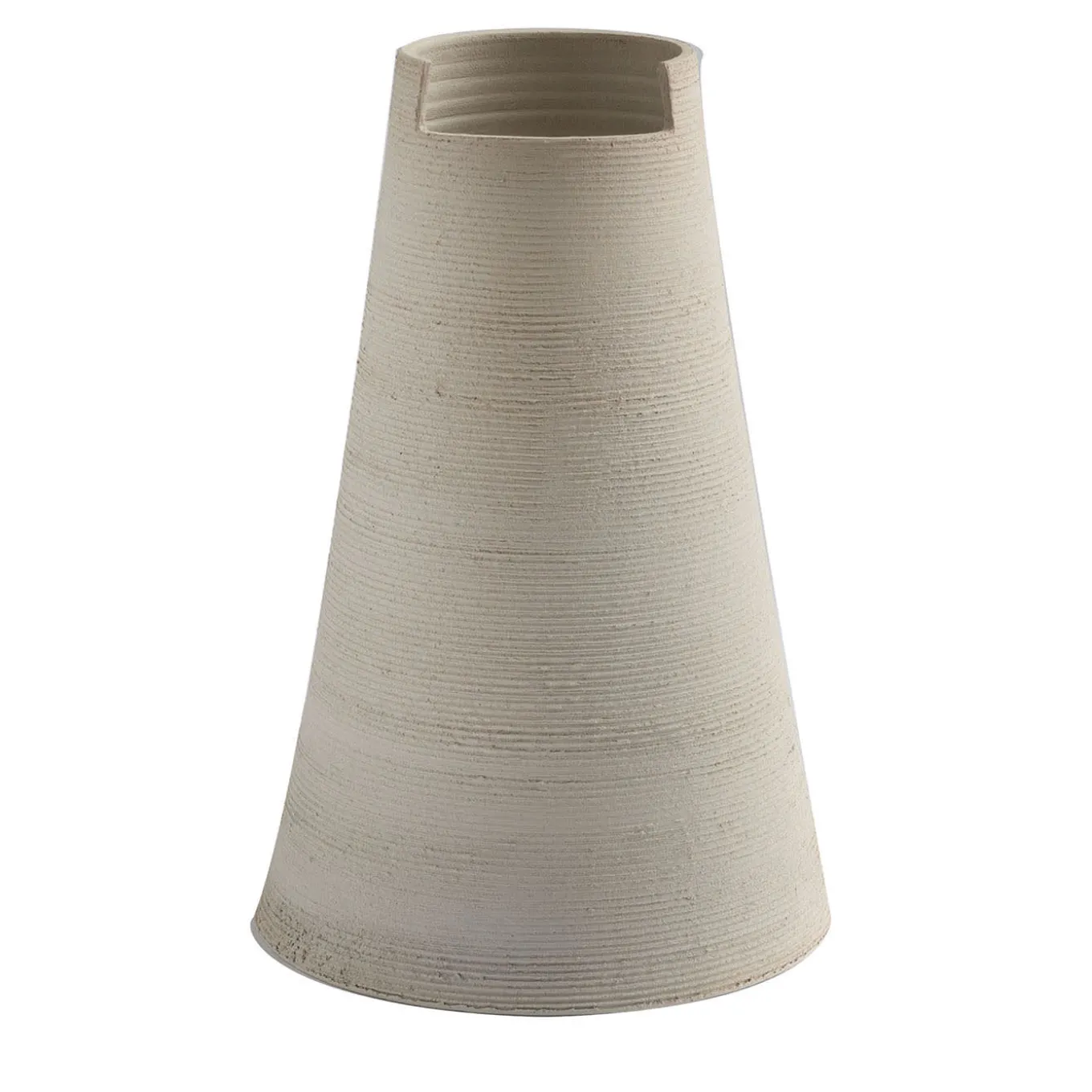 The Cut Vase Small in Light Sand features clean, minimalist cuts, handcrafted from clay by skilled turners. Inspired by Japanese Zen gardens, its design evokes tranquility and meditation, with a light sand finish that recalls the serene lines of a rake in the sand. It is fired in a single “biscuit” baking process, highlighting its natural color and striped texture. Available in different finishes.