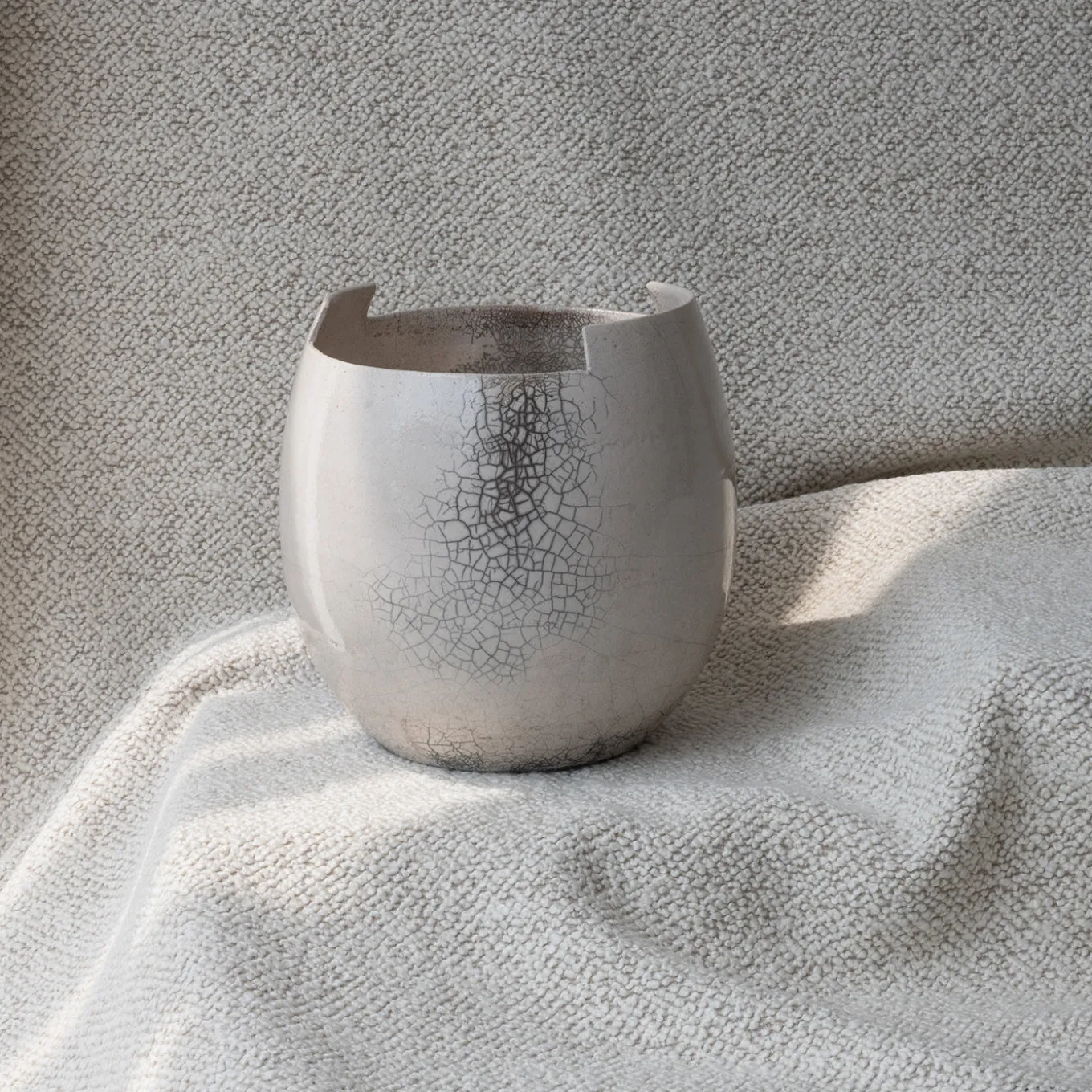 Distinguished by sharp cuts, our clay pieces are carved by the turner. Their minimal design draws inspiration from Japanese oriental taste, the birthplace of the Raku technique used. The aesthetic focus of Raku ceramics is on wabi-sabi: an ideal of beauty found in imperfect and weathered objects. In Raku firing, the glaze and smoke determine the texture of the vessels. Available in other finishes, please contact the Concierge for more details.
