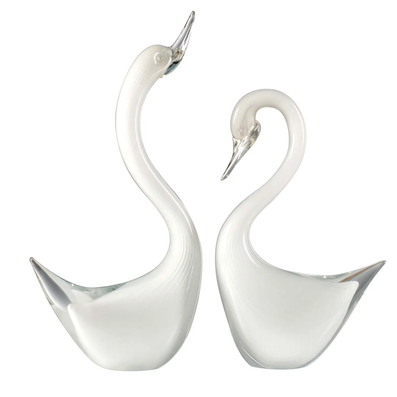 Masterfully handcrafted of Murano glass, this pair of white swans will be a classic addition to any mantle or bookcase in a living room or private study. The swan bodies are crafted of white glass with subtle fluting along the long necks and breast to mimic the texture of feathers, while the prominent beaks and eyes are made of clear glass. The purity of the glass heightens the bold character of this sculpture, making it the focal point of any decor.