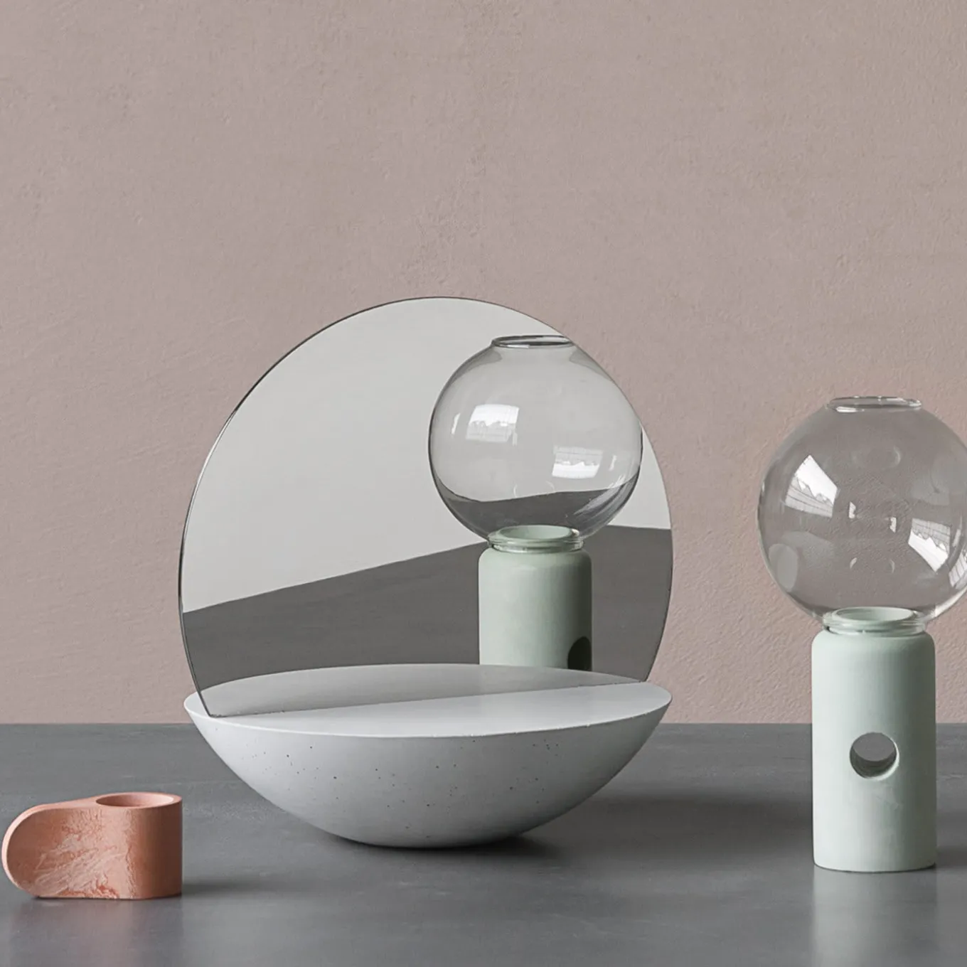 This eye-catching double-sided mirror holder is composed of a semi-spherical base in concrete with a white finish and a disk of polished steel inserted in the slot at the center of the casting. Highly decorative and unique, this object of functional decor will enliven any room, such as a bathroom, a vanity desk or a console, in a modern or industrial-inspired interior. Entirely handmade, no piece is the same. It is available also in dark grey, medium grey, sage green or “glitch”.