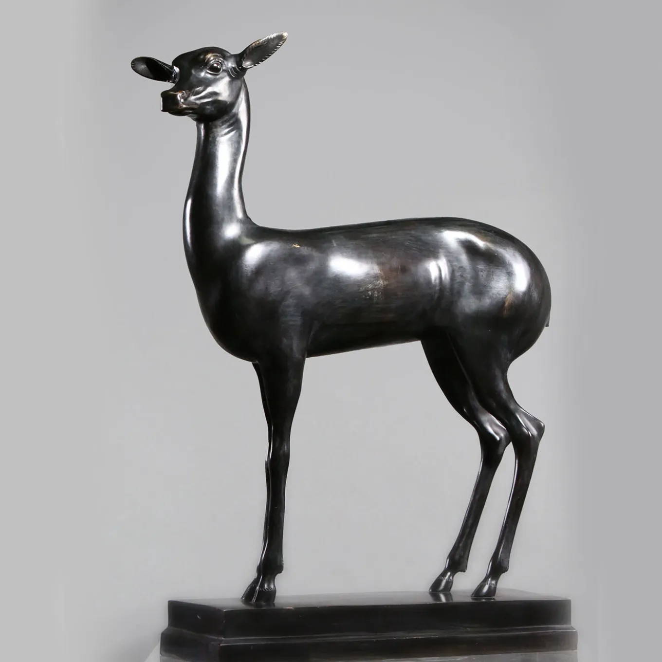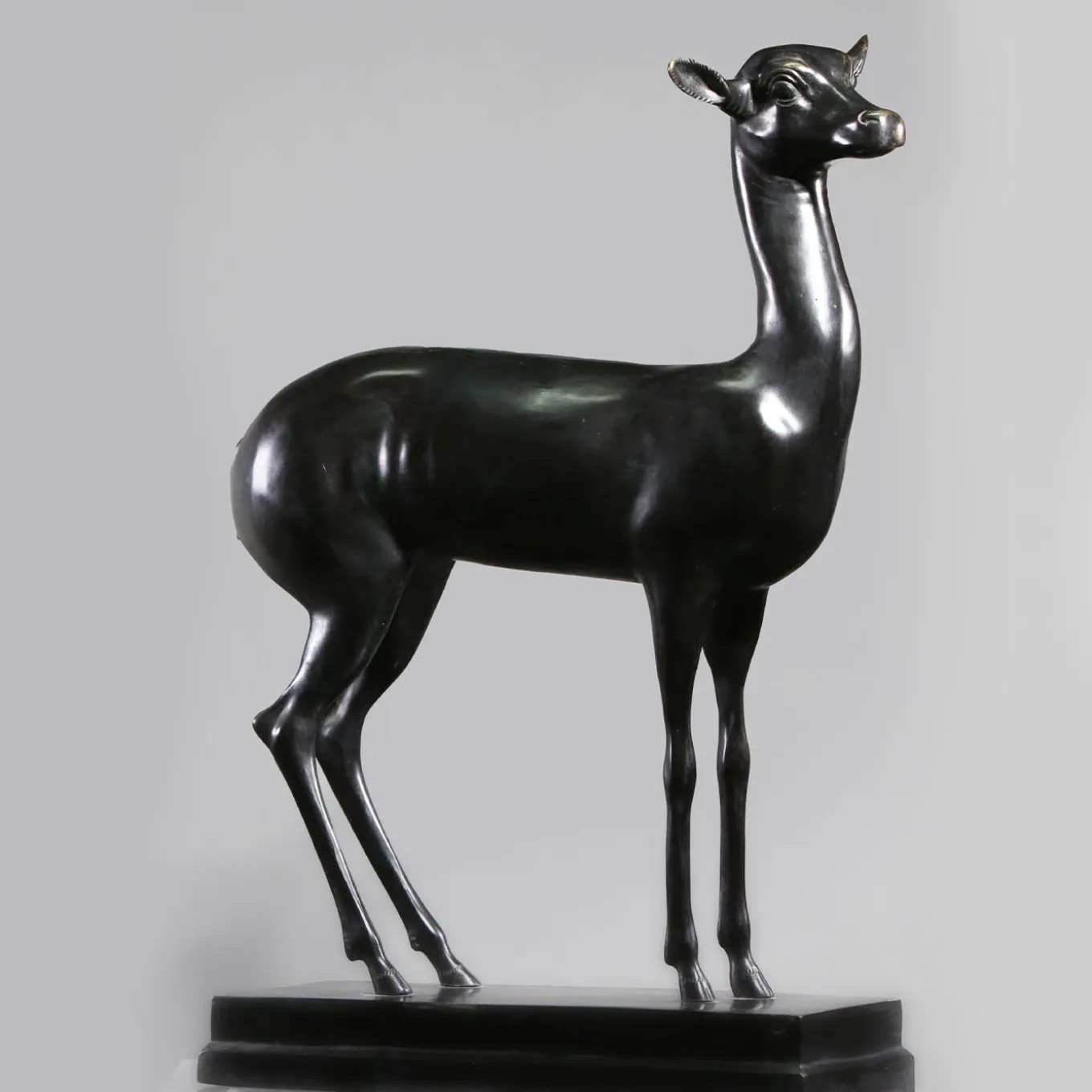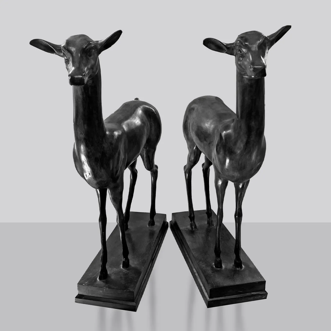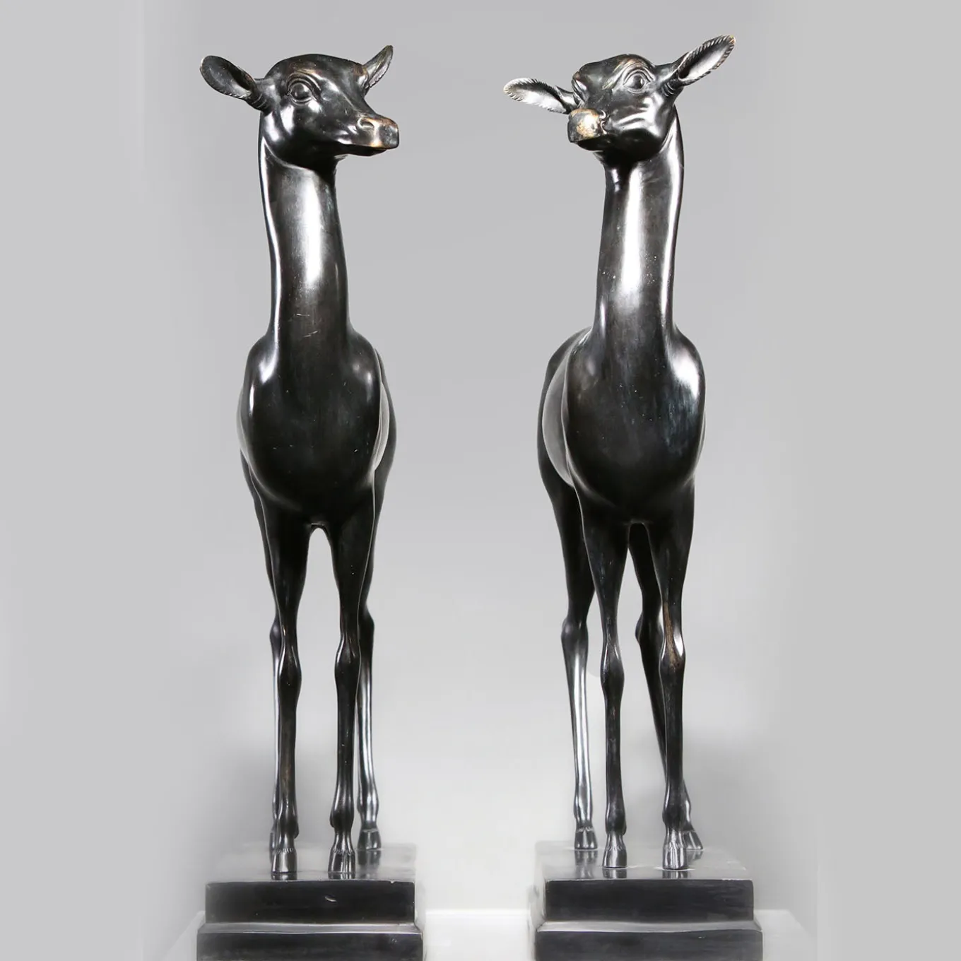 This captivating set of two deer-shaped sculptures evokes the wildness and tranquility of woods. Elegantly sitting on consoles, dressers, or desks, their zoomorphic design is associated with gentleness and grace. Tiered bases fashioned of bronze complete the piece.