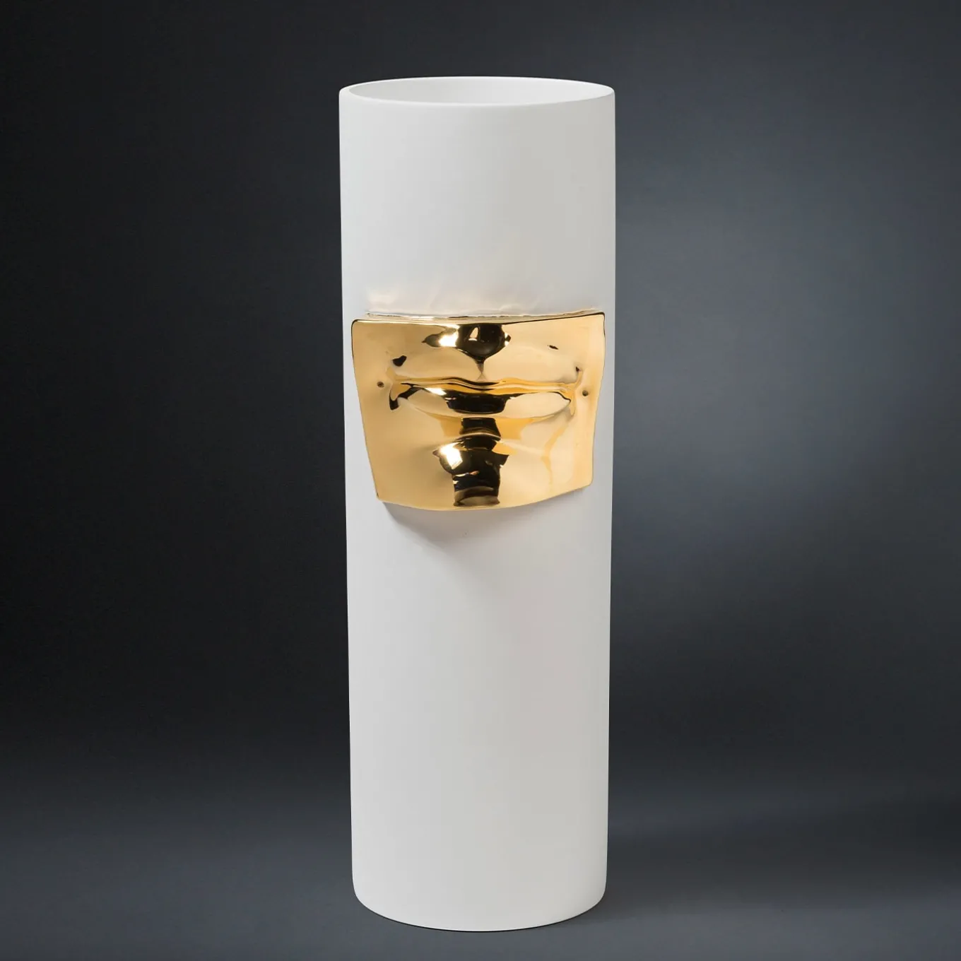 Revealing the subtle elegance of Italian art and handicraft, this stunning vase boasts an elegant and refined flair. Marked by a sleek cylindrical silhouette, it is masterfully handcrafted of white ceramic and features a magnificent low relief depicting Michelangelo’s David lips plated in 24k gold.