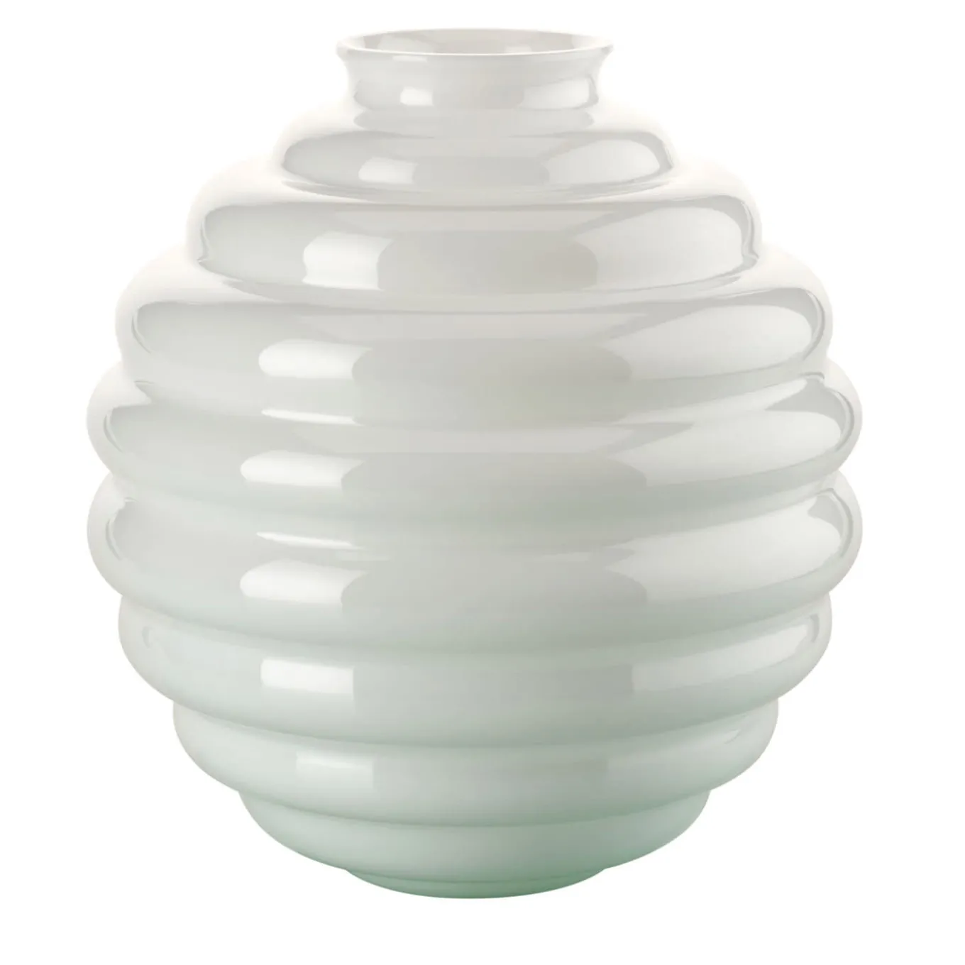 Highlighting the exquisite opaline “lattimo” palette, characteristic of Murano glassmaking art, this captivating Decò vase showcases the rounded Nouveau silhouette from its original 1930s design by Napoleone Martinuzzi. Graced with an archetypal spiral shape, the timeless elegance of this sculptural objet d’art will make an exceptional impact in a distinguished classic or modern interior.