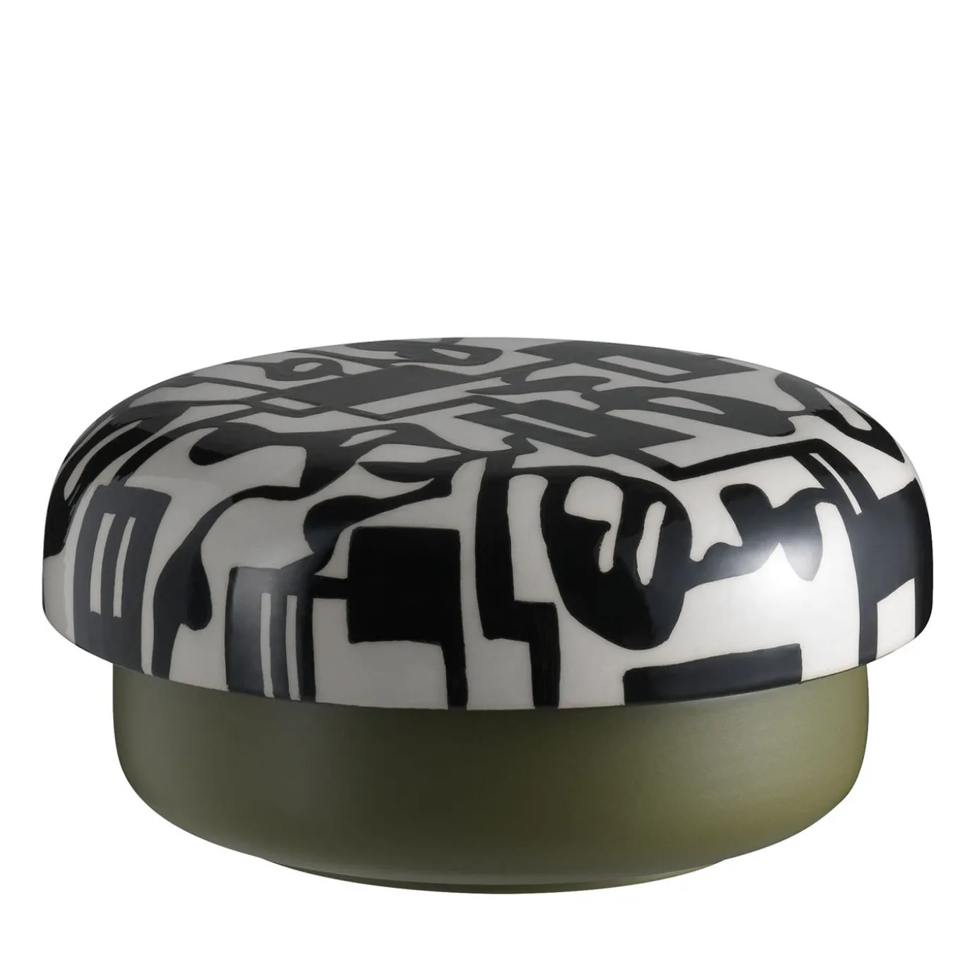Dédale is a play of attraction and entrapment: the essence of a mythical labyrinth that beckons you to enter. Part of a series of 3, Dédale invite you to lose yourself in beauty, with a maze of shapes both rigid and fluid. This handmade clay vase features a matte green glaze on the base, hand-painted black decoration, and a crystalline finish on the top. Designed by Jean-Christophe Clair.
