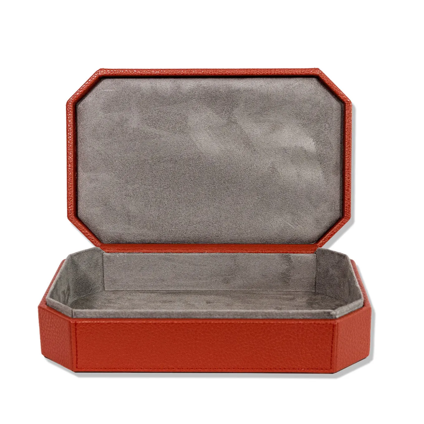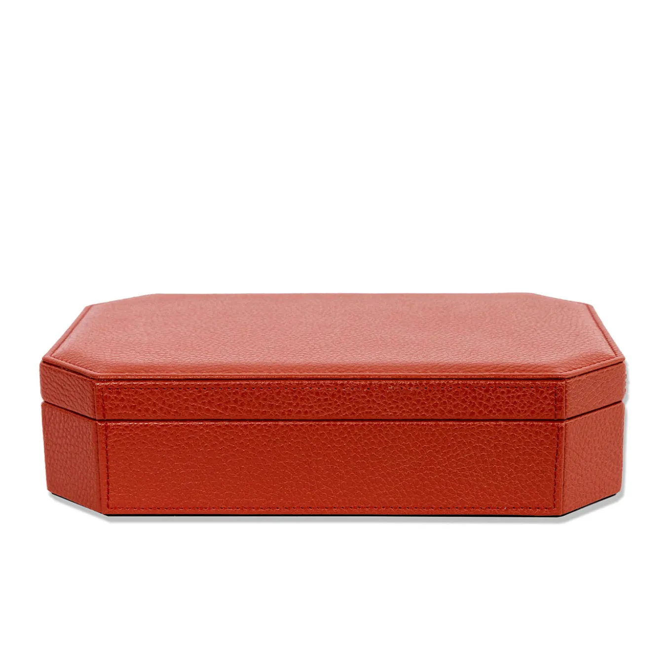 This box features a wooden structure dressed with genuine fine, soft leather in a rich Persian Red shade. Its interior is lined with microfiber, providing a delicate and protective space for storage. Del Monte Box 25 combines refined texture with practical design, suitable for organizing various items while enhancing home décor. Also available in fourteen additional colors. For more details, contact our concierge service.