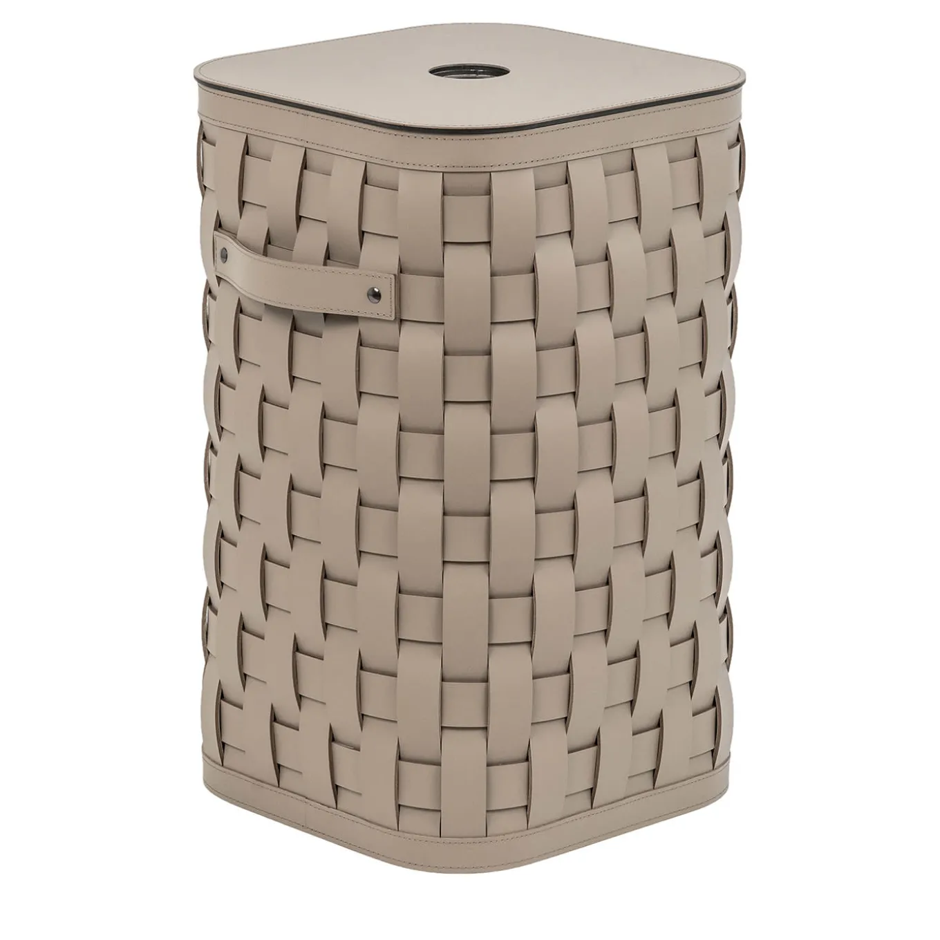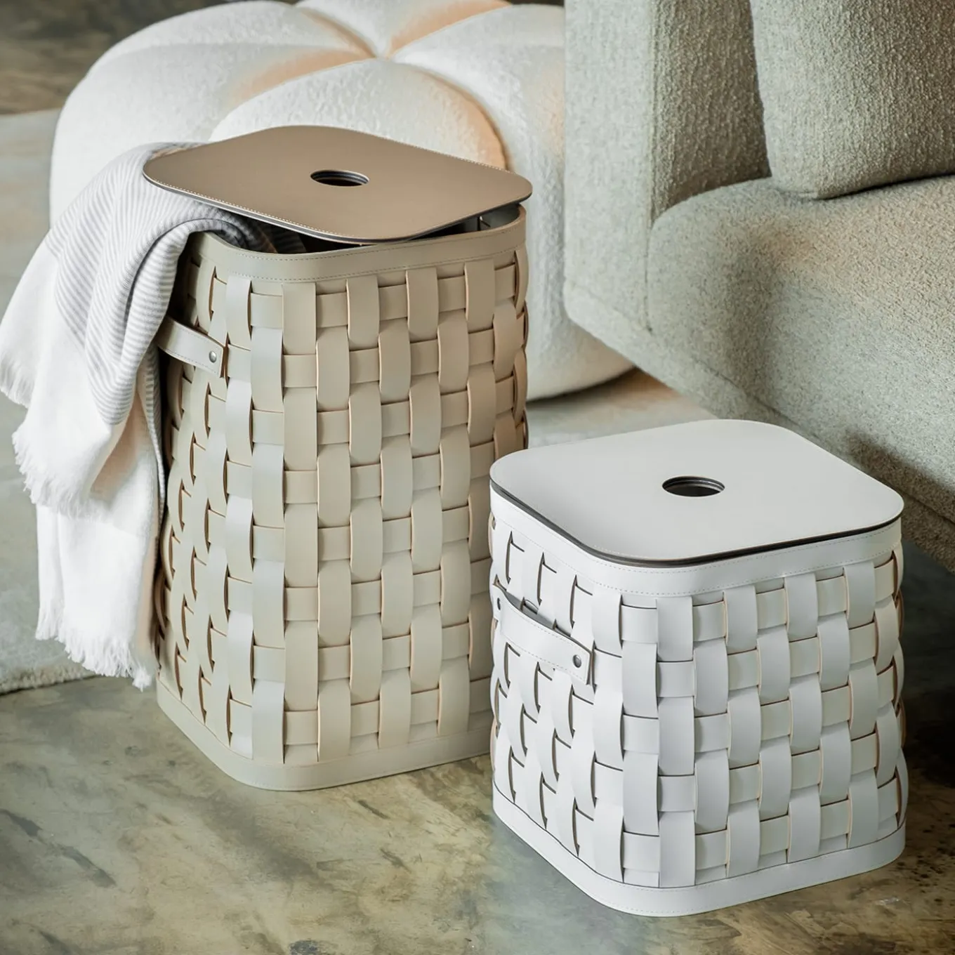 This small laundry basket stands 50 cm tall and is made from gray, handwoven leather. It features a matching flat cover and is available in a variety of different sizes and shapes. It can be further customized in any color from the Antibes line. Suitable for outdoor or indoor use.