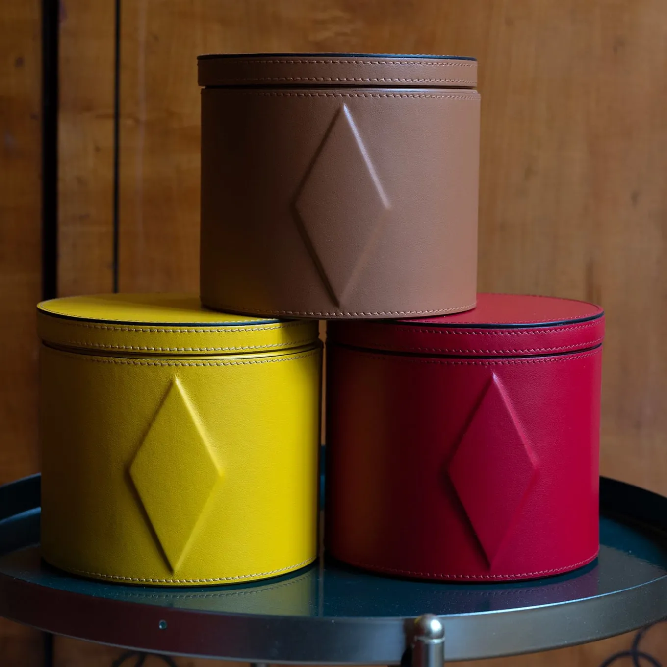 Box entirely lined in leather with an embossed geometric motif, Luhdo’s leitmotif. An object for oneself or an exclusive gift in which to store one’s own objects or as a furnishing accessory.
