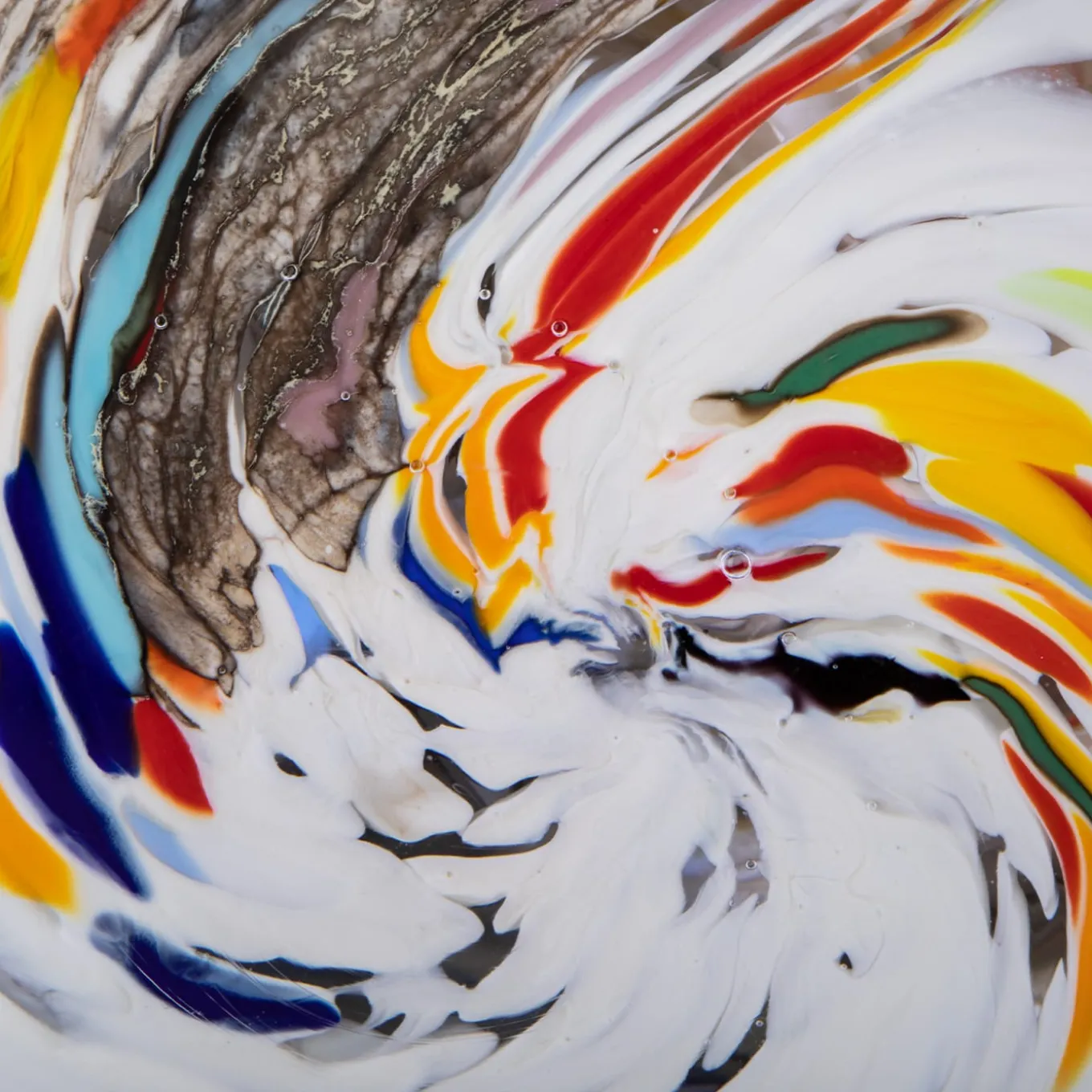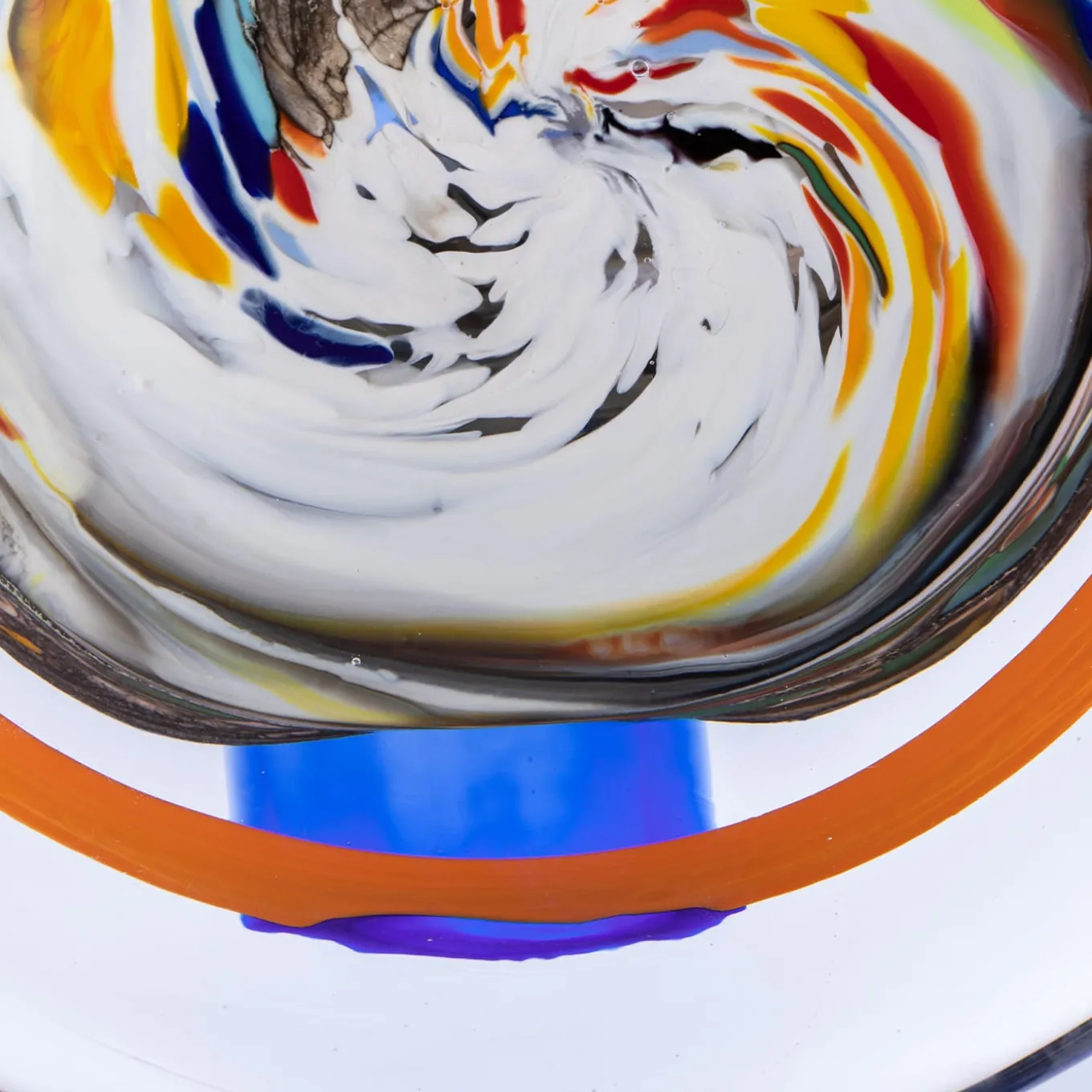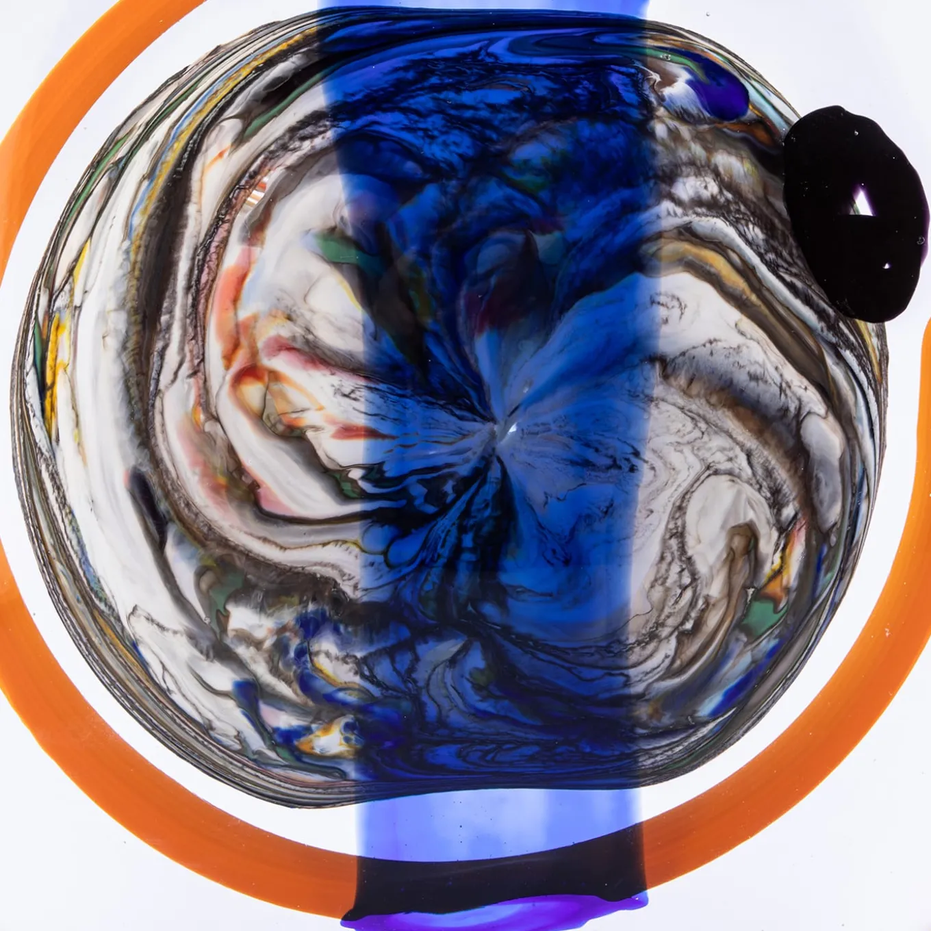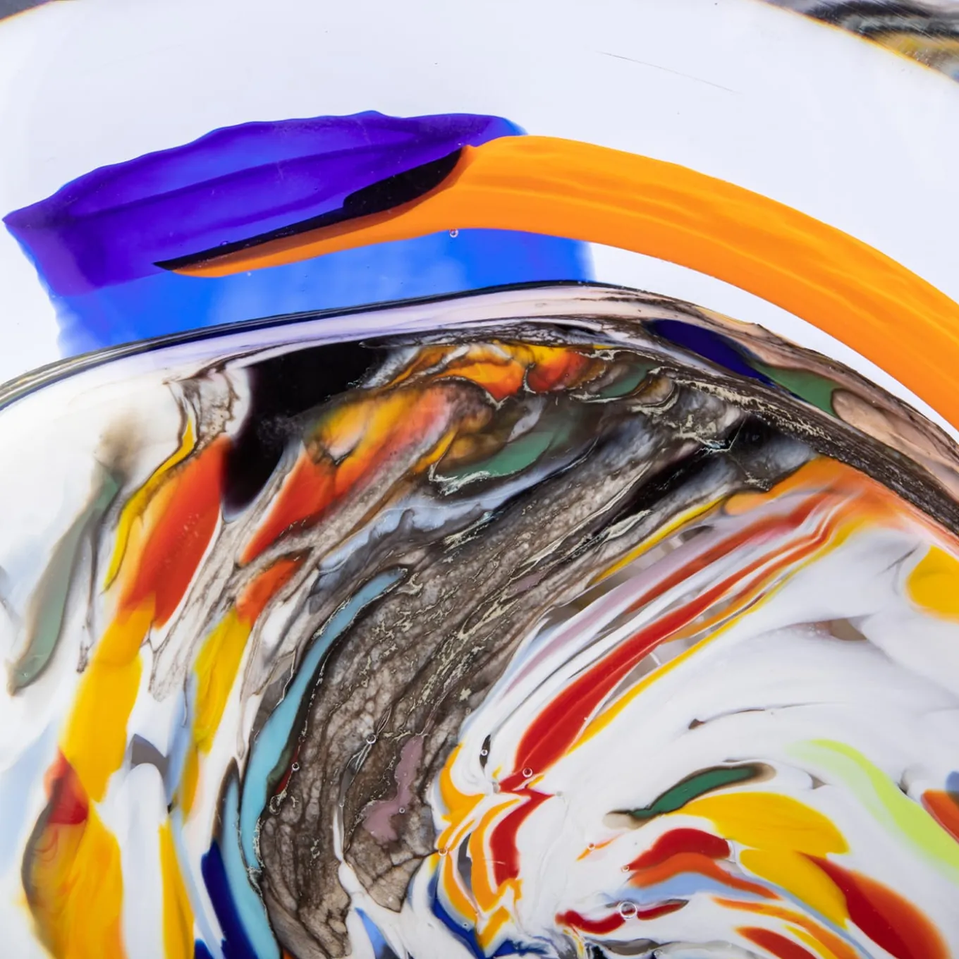 This precious glass sculpture is sure to catalyze attention wherever it is placed, striking in its abstract, multicolor design. Comprised of a ground, rock-like black base and of a clear glass disk into which is trapped a polychrome ensemble of glass elements, it is deftly handcrafted by Venetian master glassmakers using the “sommerso” technique. Crafted in February 2021, it is supplied with an authenticity certificate.
