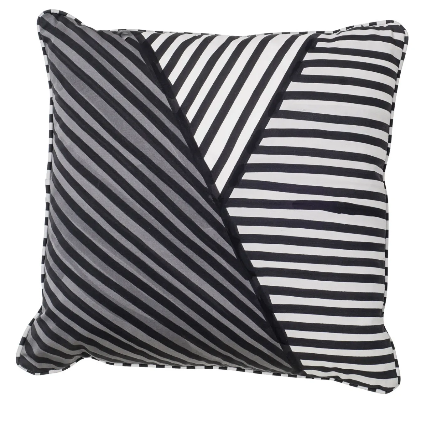 This elegant cushion has a down insert with a cover decorated using the pigment printing technique with striking parallel and perpendicular thin black lines over a dark grey and white background.