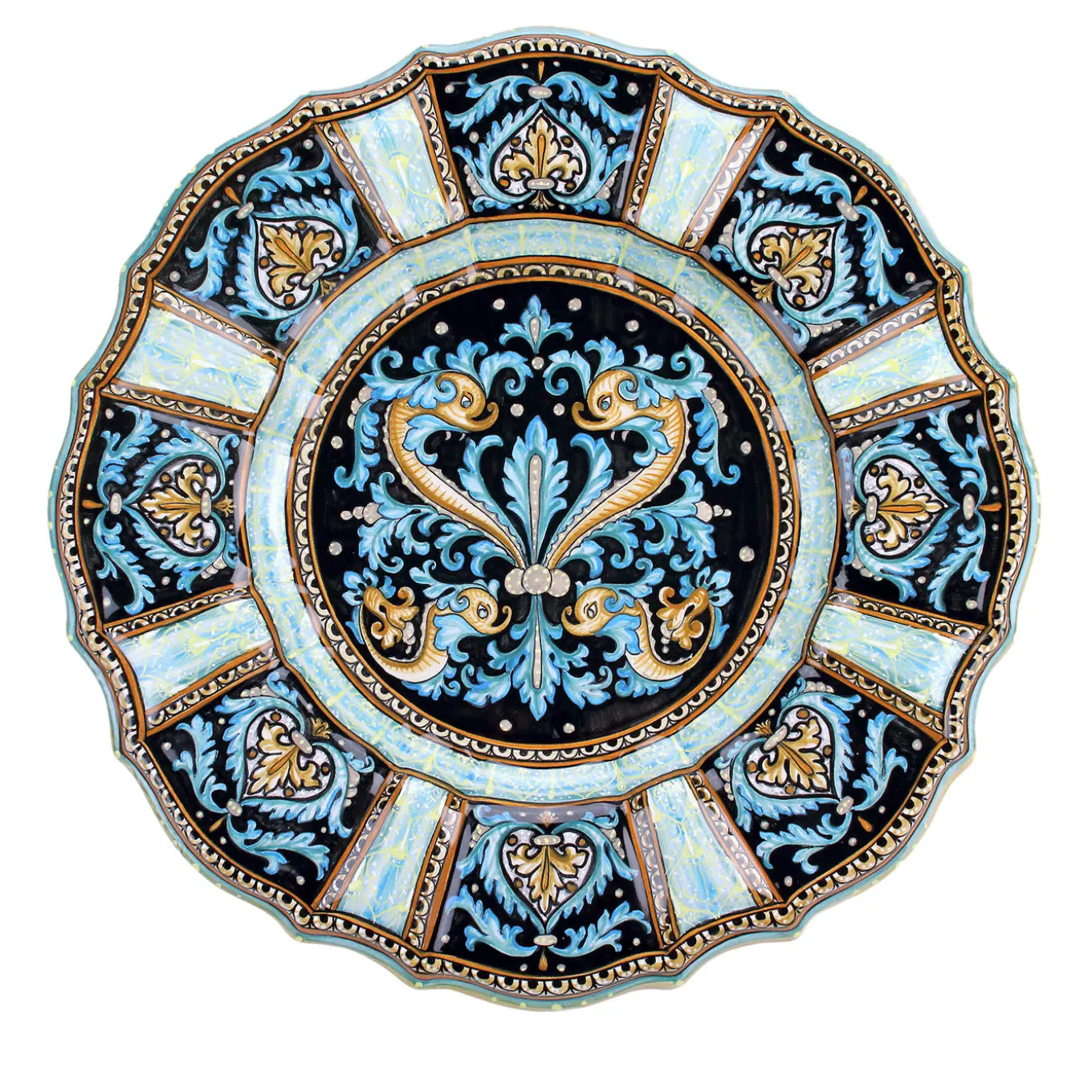 The Dolphins plate features a polychrome majolica finish with a wavy mixtilinear edge and a radial pattern of sixteen bands. Eight bands display symmetrical leaf shoots framing heart-shaped designs with acanthus leaves, while the other eight showcase peacock feather motifs on a shaded blue and green background. Four golden yellow dolphins appear in mirror symmetry, contrasting with celestial vanadium tones. Gold lobed motifs frame the edge and bands. The back includes decorative elements and a certification mark. Slight variations may occur, reflecting artisanal craftsmanship.
