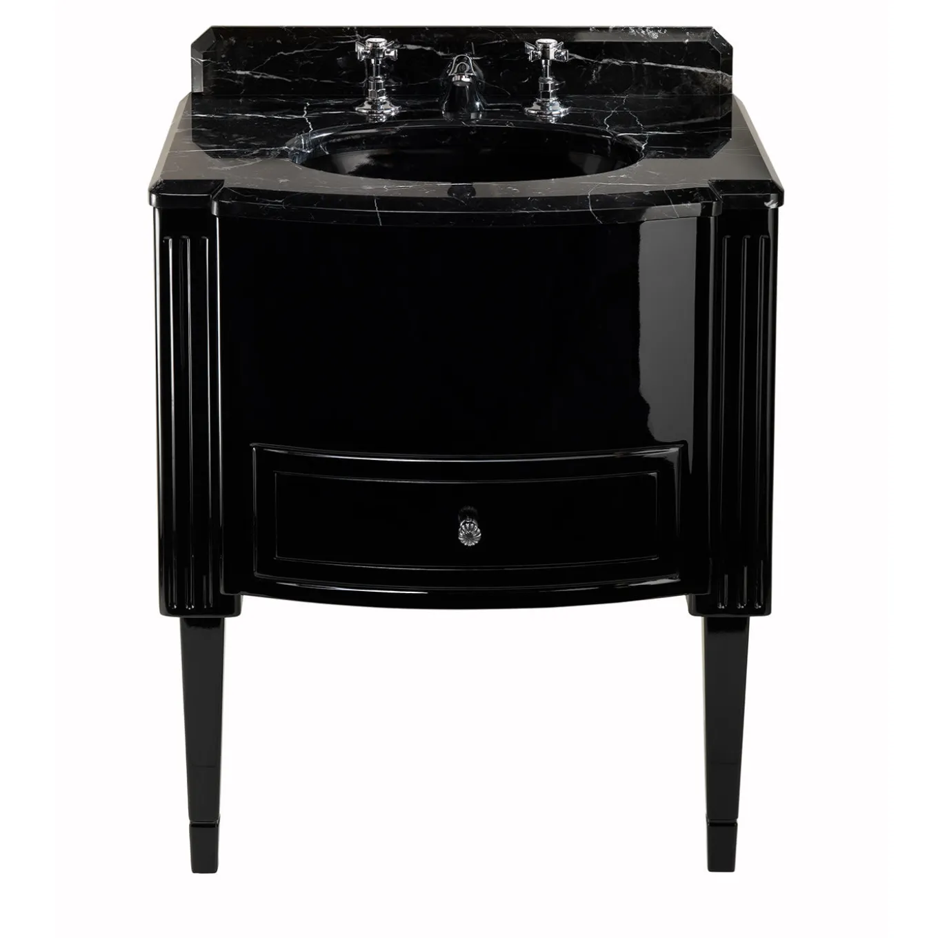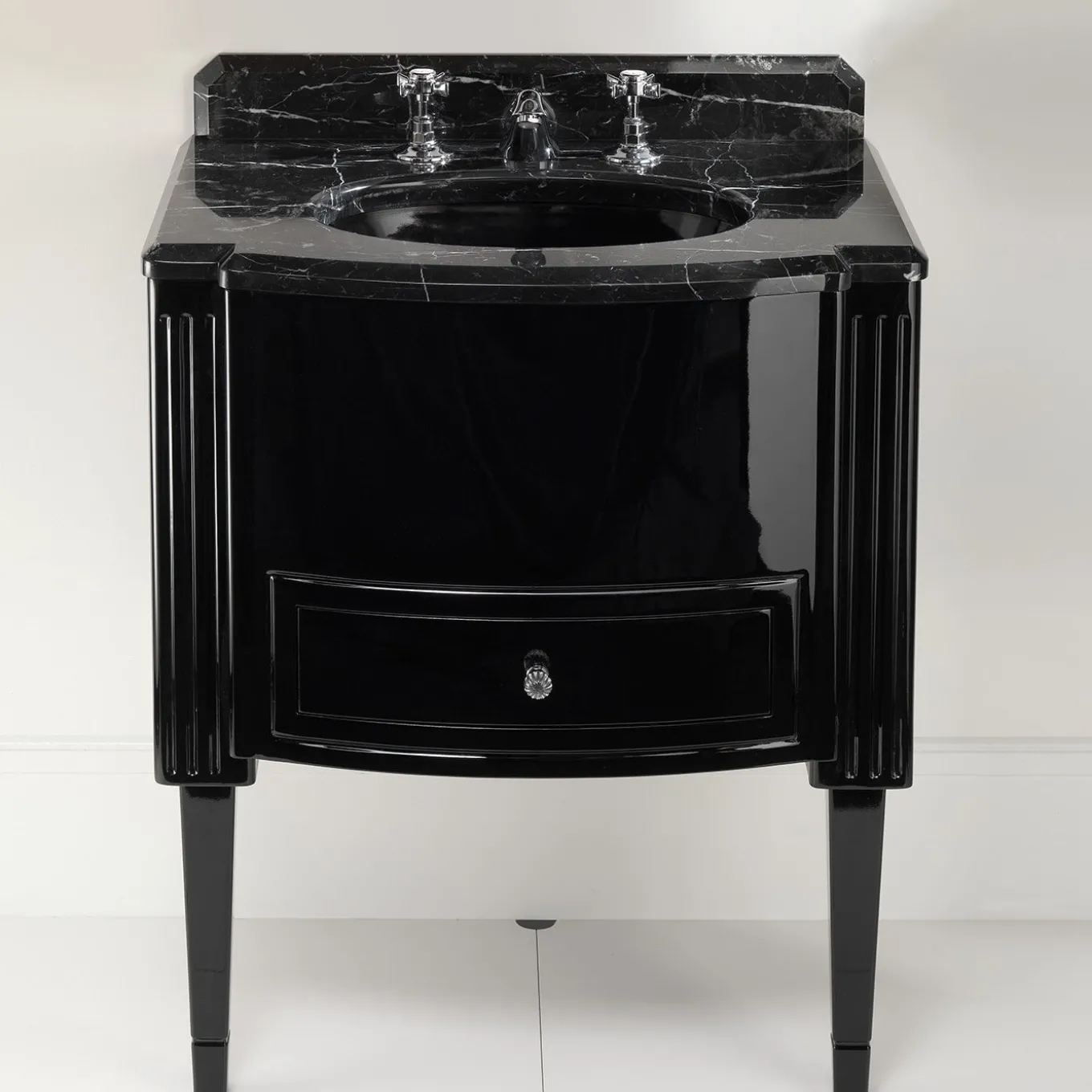 Dominio Vanity Unit ironically reinterprets the look of the liqueur cabinets for a washbasin unit with truncated pyramid legs referring to the American Forties style. The top is in fine marble. Its base, with a drawer for storage, is available in the other colors, please contact the concierge for further information.