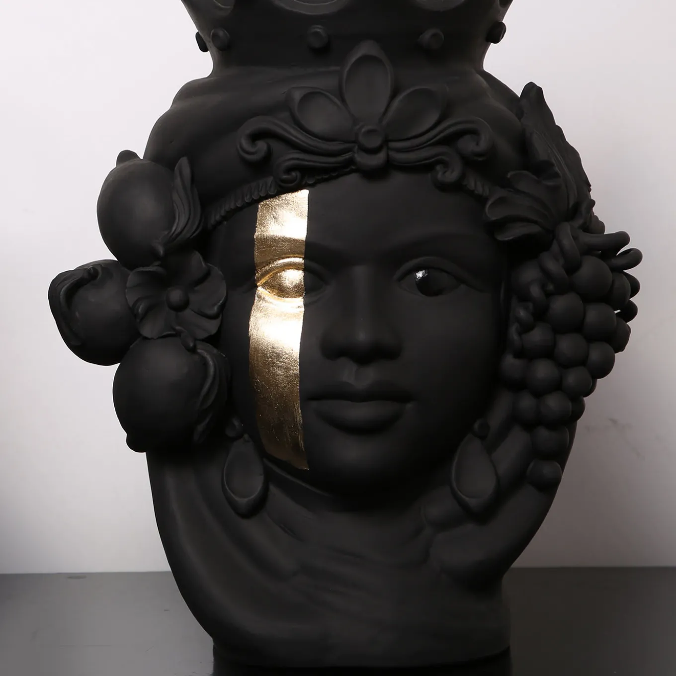 A captivating ode to traditional craftsmanship and modern sensibility, this anthropomorphic vase of a Sicilian woman recalls the grandeur of Sicily’s Arab domination. Crafted with care by master ceramicist Stefania Boemi, this piece is hand glazed in a deep black matte hue and boasts an expressive visage with an ornate headdress and crown flanked by locks of hair intertwined with Sicilian lemons. One of the eyes features a gold foil band running vertically down the face, striking touch, emphasizing the beauty of the woman’s gaze. The vase cannot be filled with water.
