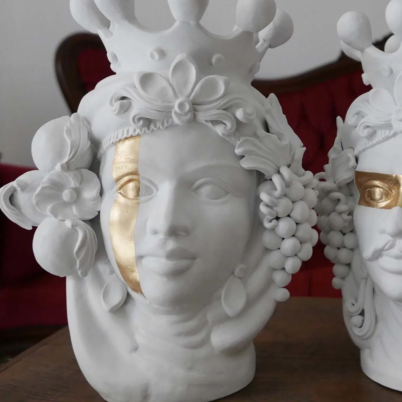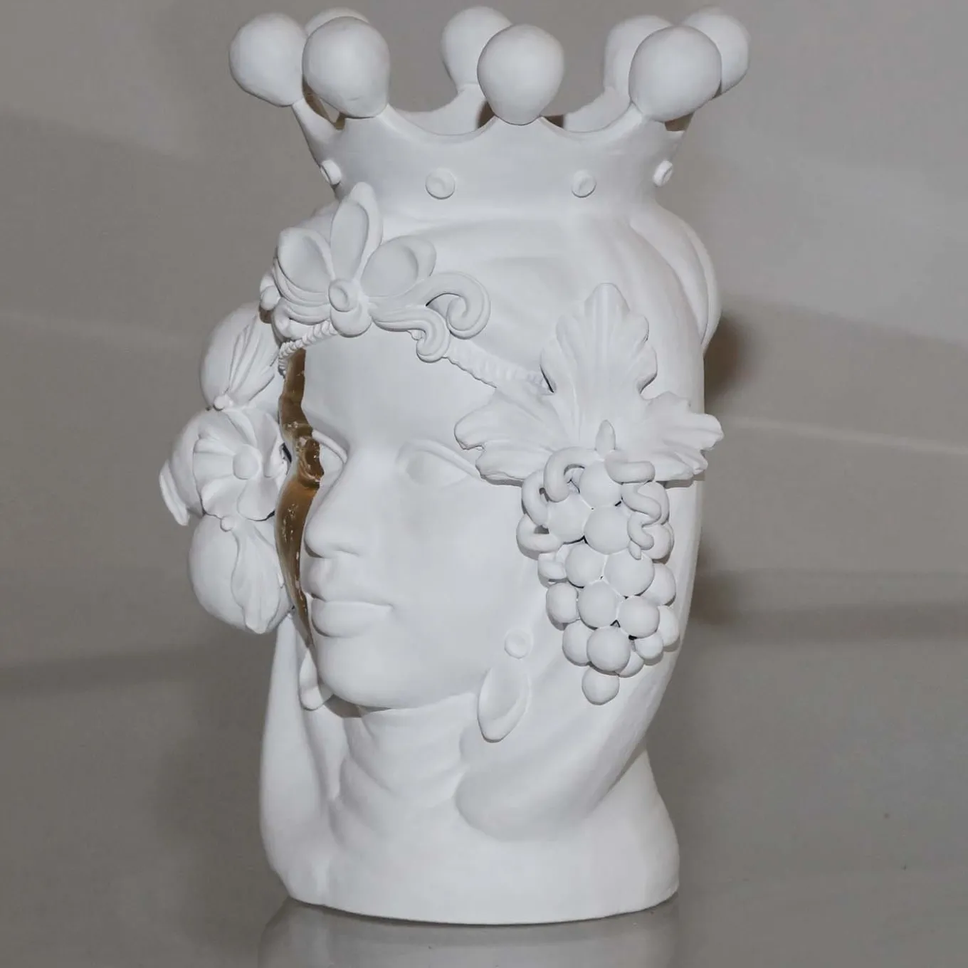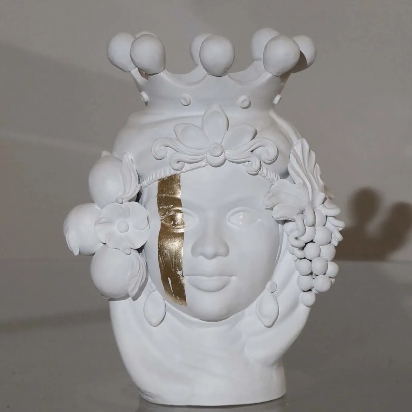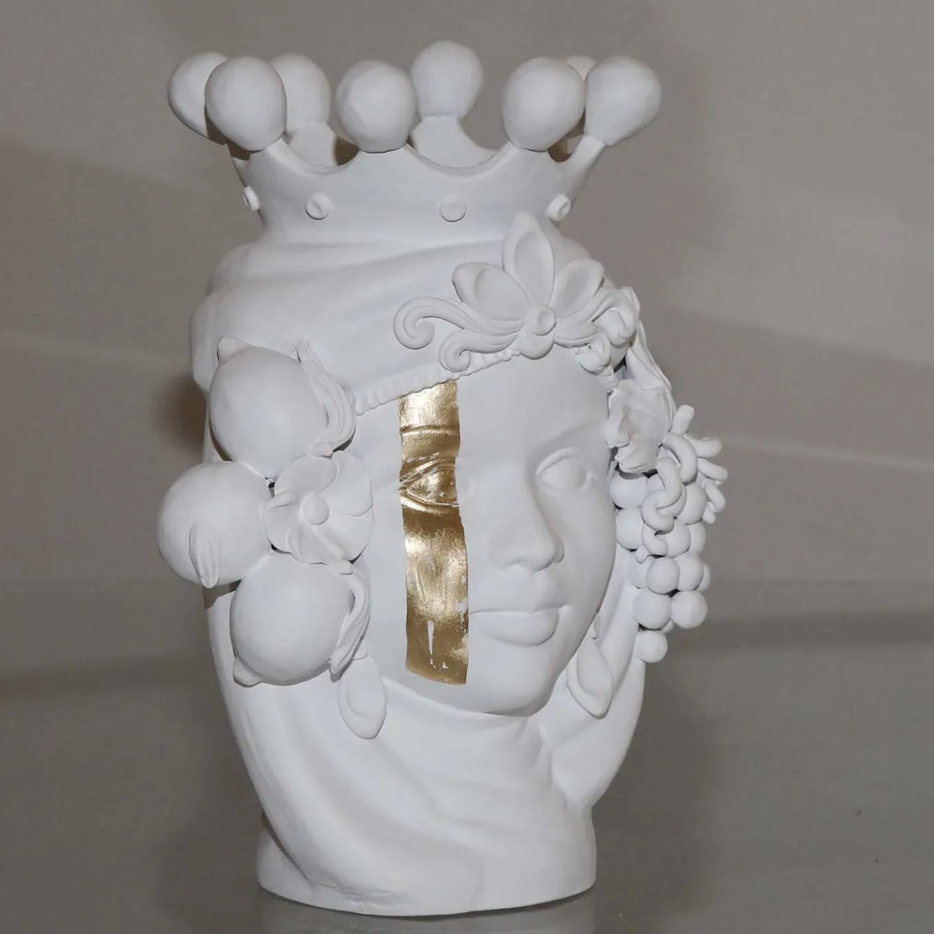 Distinguished for its deft use of sculptural details and simple colors, this handmade head vase will add dramatic flair to any kitchen, living room or entryway decor. This sculpture of a woman boasts a flawless white complexion framed by a supple grape, floral locks of hair and a regal crown. The subject, drawn from a Sicilian legend from the Muslim conquest, is re-imagined with a modern touch and crafted of terracotta with a matte white glaze that is accented by the bold gold leaf stripe running vertically down the face, emphasizing the beauty of the gaze. The vase cannot be filled with water.