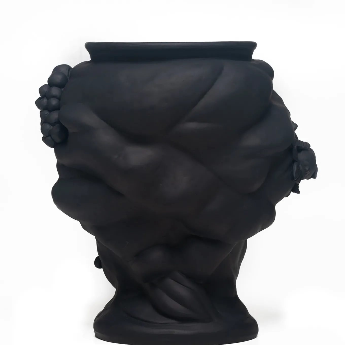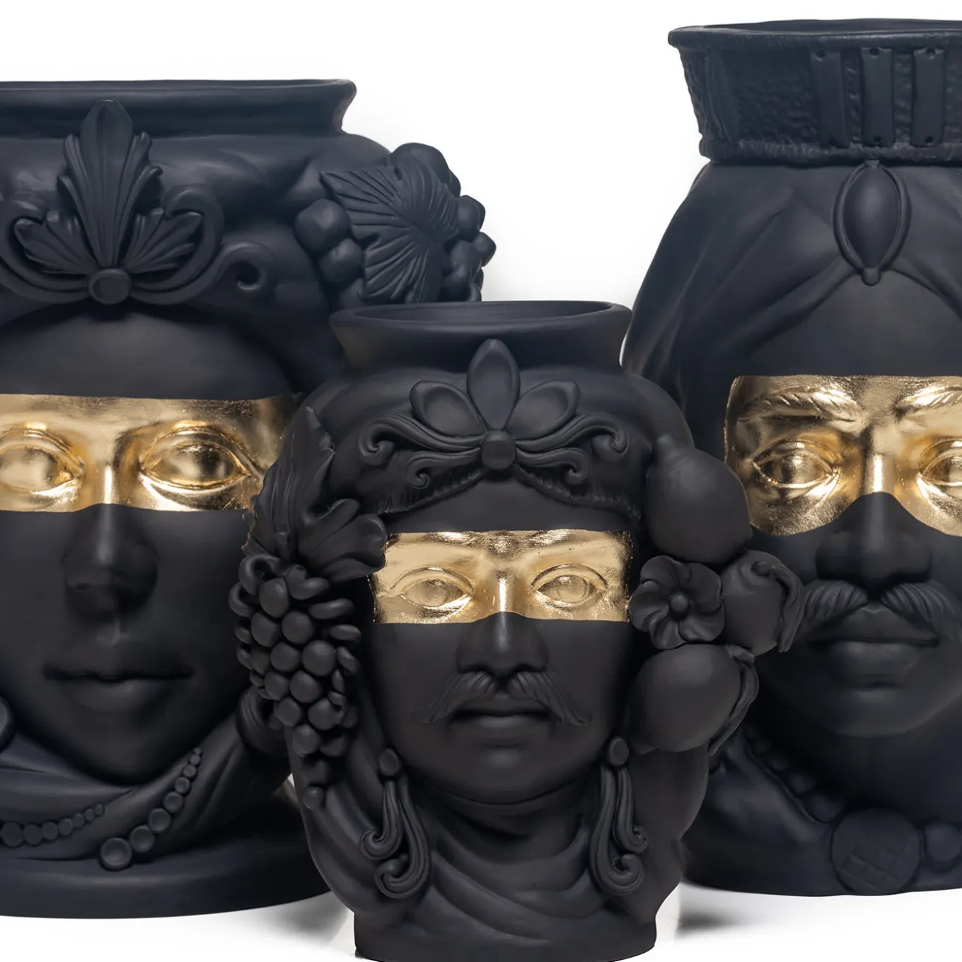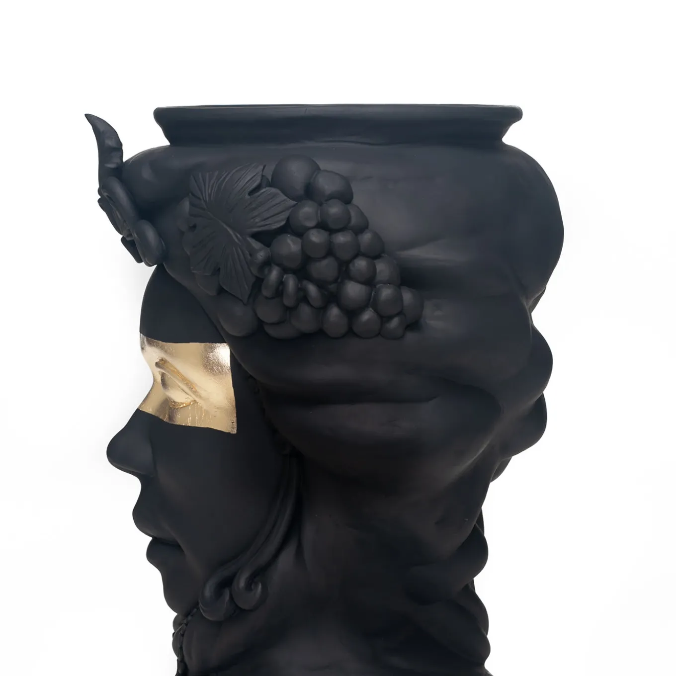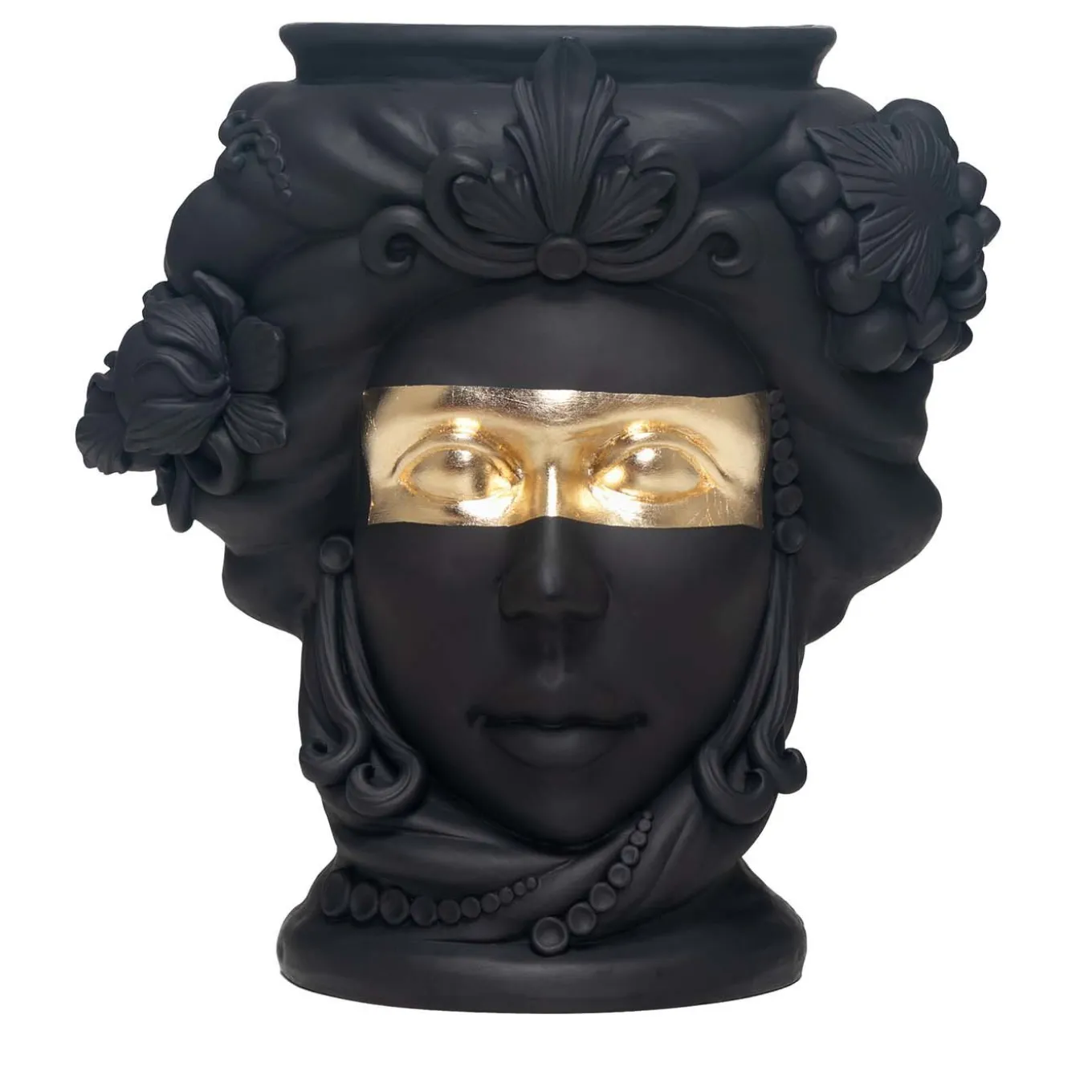 The grandeur of Sicily’s Arab domination is celebrated in this anthropomorphic terracotta vase that depicts a Sicilian woman handcrafted by master ceramicist Stefania Boemi. The ceramic is hand-glaze in a deep matte black that enhances the expressive visage of the woman and her ornate headdress and crown, from which locks of hair are intertwined with Sicilian lemons. A band of gold foil runs horizontally across her eyes, a striking detail that emphasizes her intense gaze. The vase cannot be filled with water.