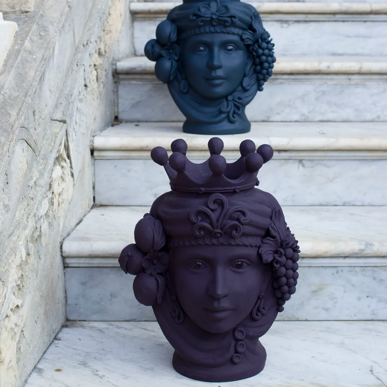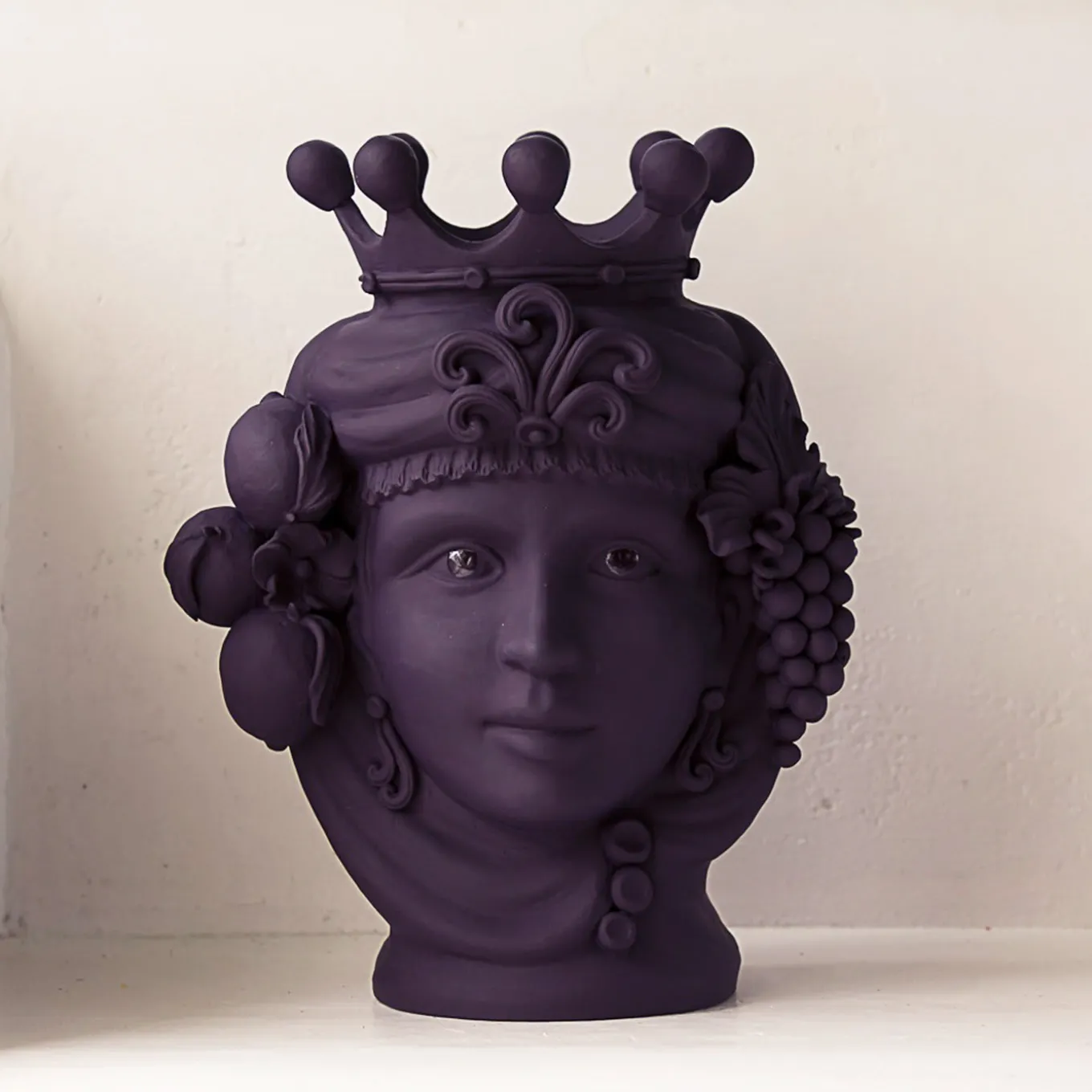 This anthropomorphic vase is made entirely by hand and painted in a dark burgundy matte monochrome tint, rich in natural pigments and resin binders that provide intense color depth. Only the eyes are glazed so they stand out, emphasizing the beauty of the gaze. The piece is inspired by ancient Sicilian legends of love and revenge between a Moor and a Maiden. The vase cannot be filled with water.