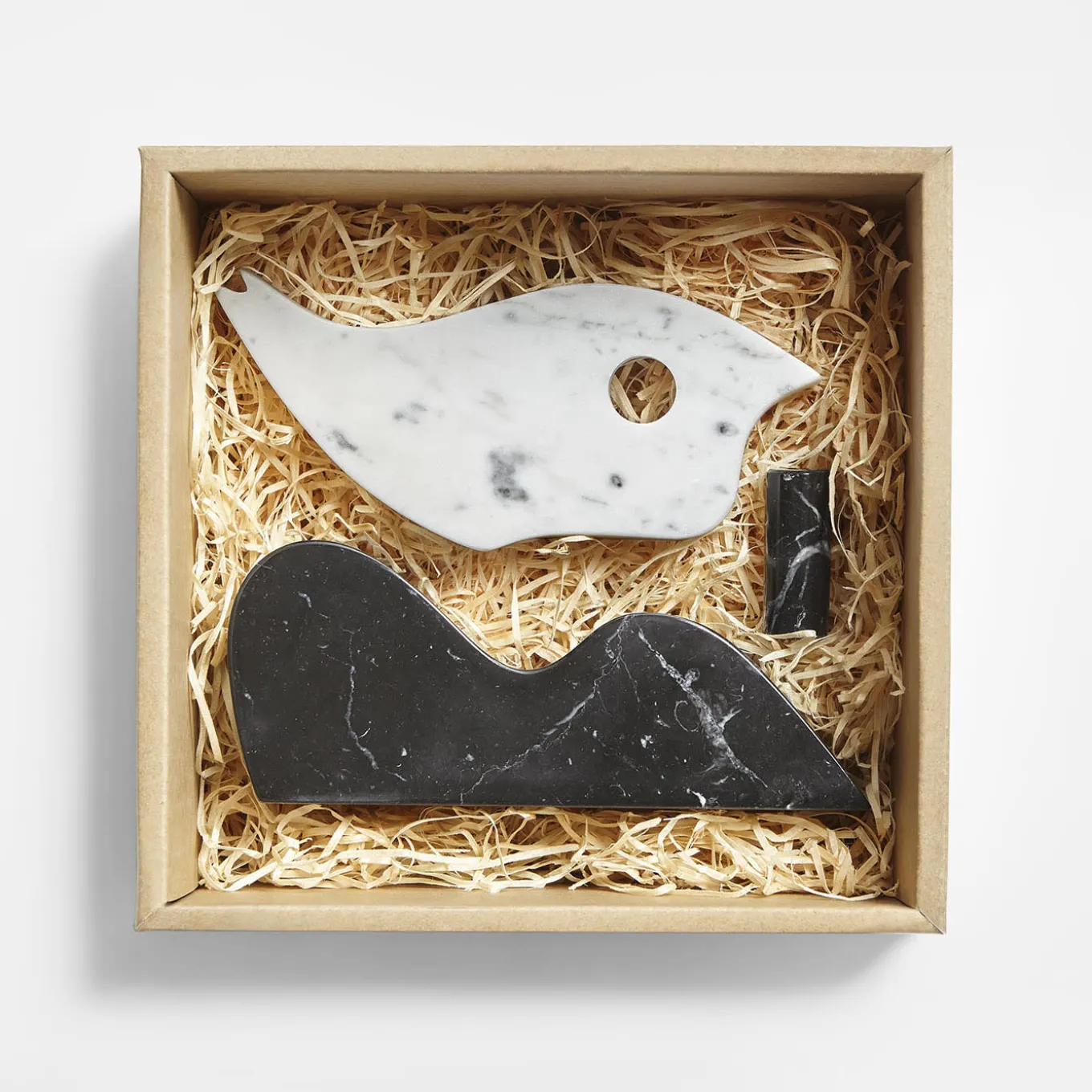 Donzella Pavonina, which is the name of a colorful fish from the seas of Italy, takes up the theme of a traveling sculpture and is part of the “Marble In Scatola” collection. The little fish rides a marble wave and has a googly eye that you insert by hand. The decomposability wants to be a game that combines the various essences of marble and makes them perceive their diversity. It is handmade of white Carrara and black Marquina marble.