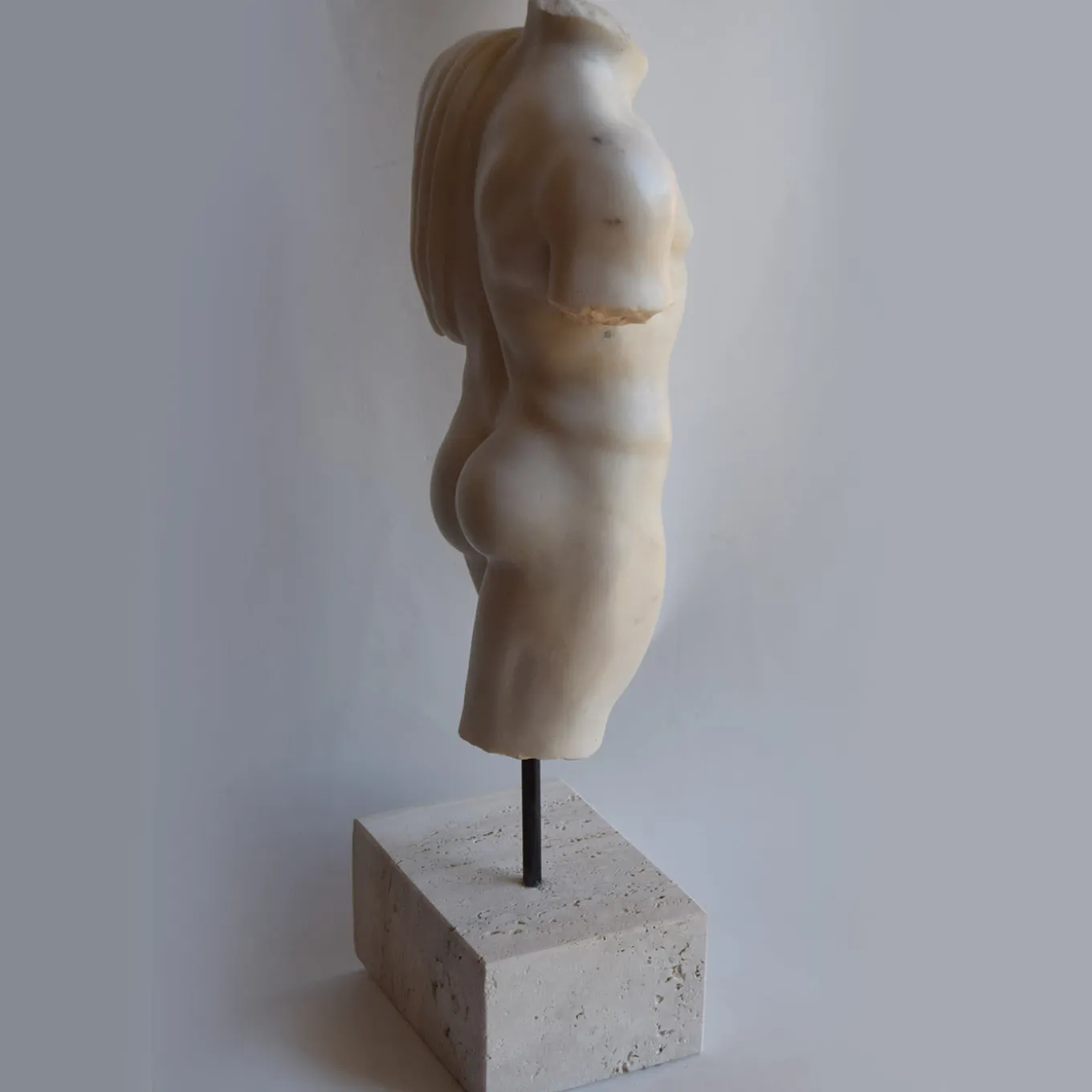 Male torso in marble with drapery placed on a Roman travertine base. Carved on white Carrara marble.