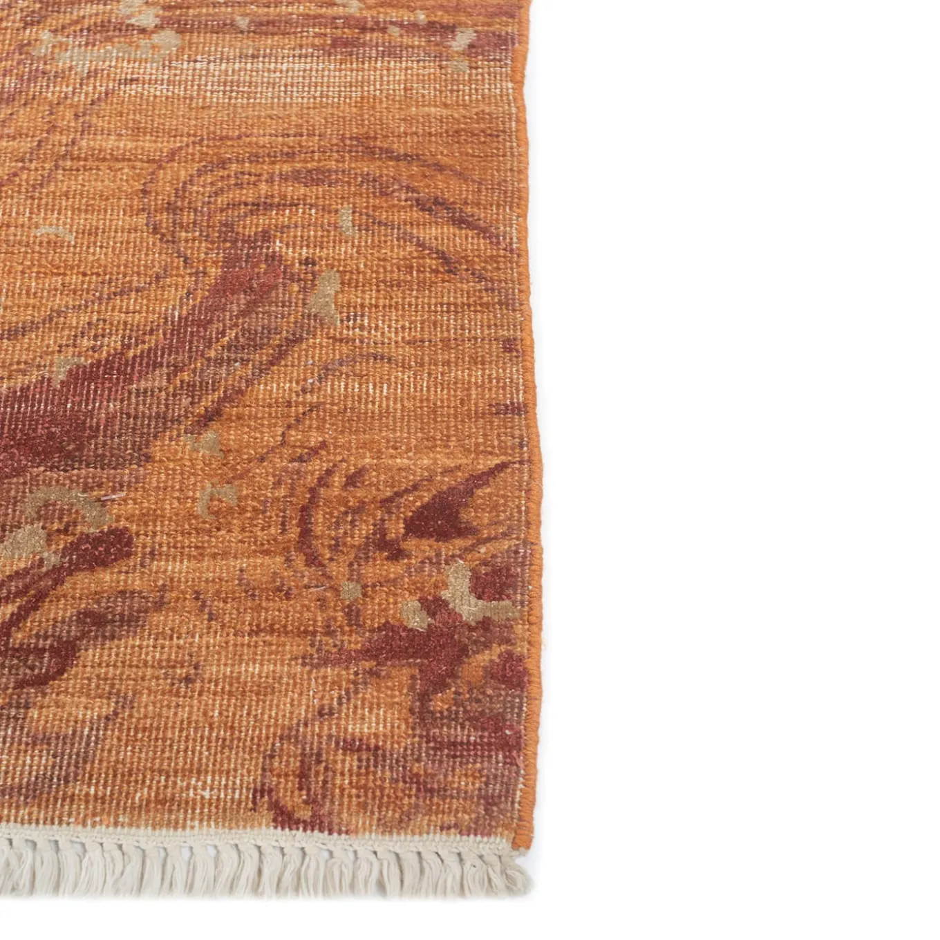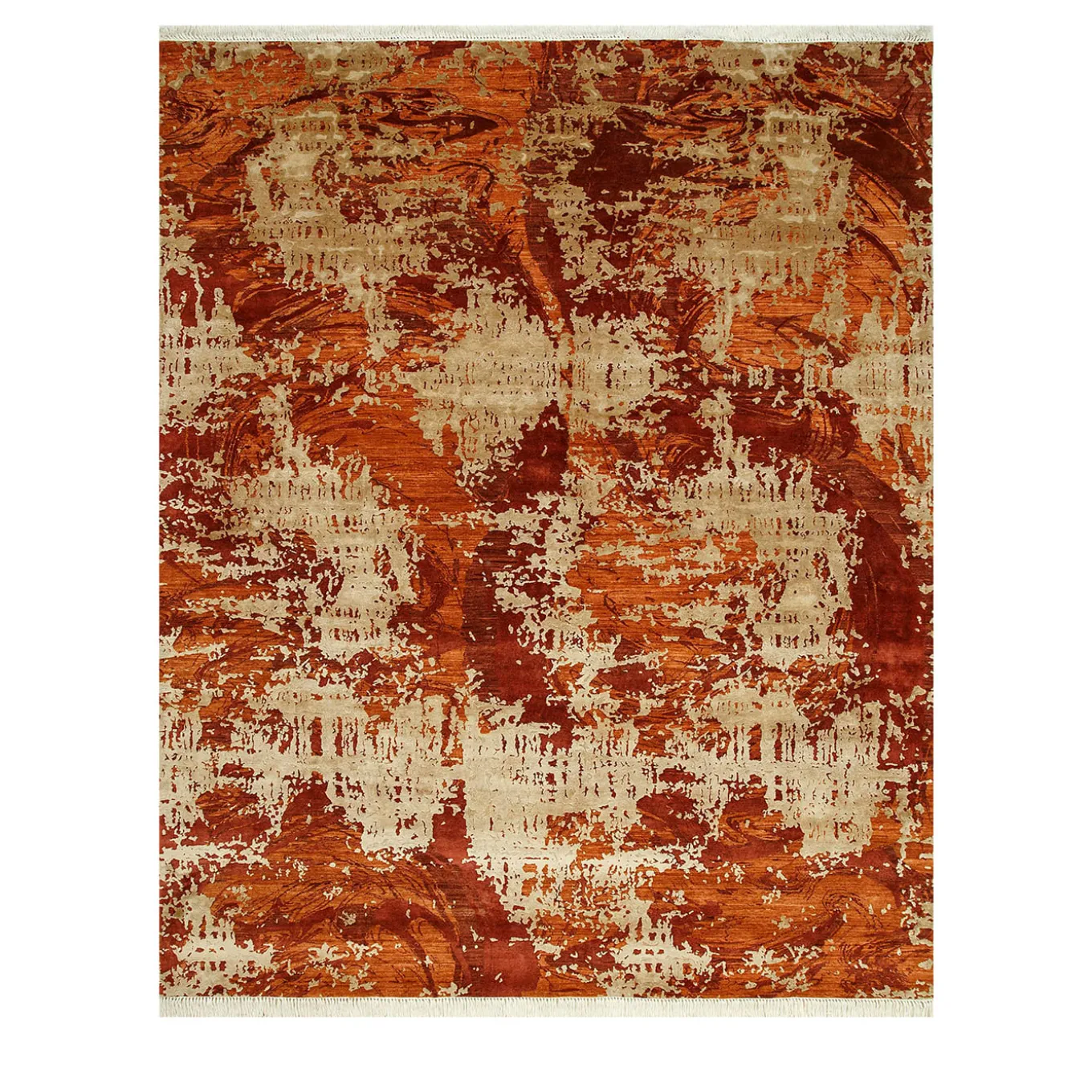 Hand-knotted from a blend of 60% silk, 30% wool, and 10% cotton, this rug balances luxury, durability, and breathability. The silk adds a subtle sheen, brightening any room, while wool offers resilience and comfort underfoot. Cotton enhances strength and airflow, making it versatile for different spaces. Warm red-orange tones, from deep crimson to vibrant tangerine, create an inviting atmosphere. It is available in various colors, shapes & sizes.