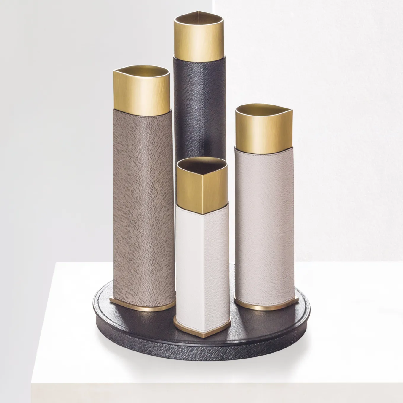 Part of the Drop series, this base is a perfect complement to the Drop magnetic vase. Thanks to its iron core, it will give stability to the vase, while providing an exquisite frame to it. Its round silhouette is in metal that was upholstered with fine leather. The cover can be customized in color and type, by choosing among the many options offered by the brand. Modern and sophisticated, this stand will complete the look of the Drop vases, to be used in any room in the house.