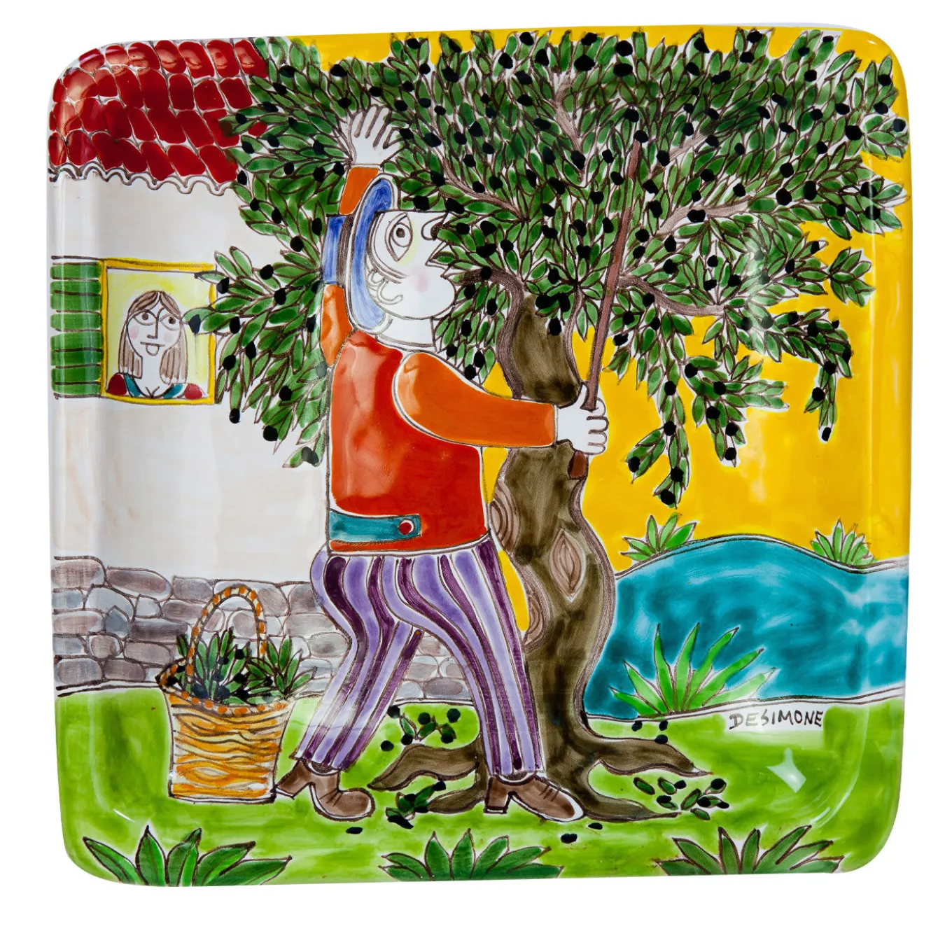 Featuring a delightful hand painted scene of a farmer picking olives, the hand crafted decorative DS Square Plate is a fine piece of ceramic craftsmanship. A hole in the back allows the 20 x 20 cm plate to be fixed to a wall if desired and the vibrant colors liven up the room, complimenting both modern and classic furnishings.