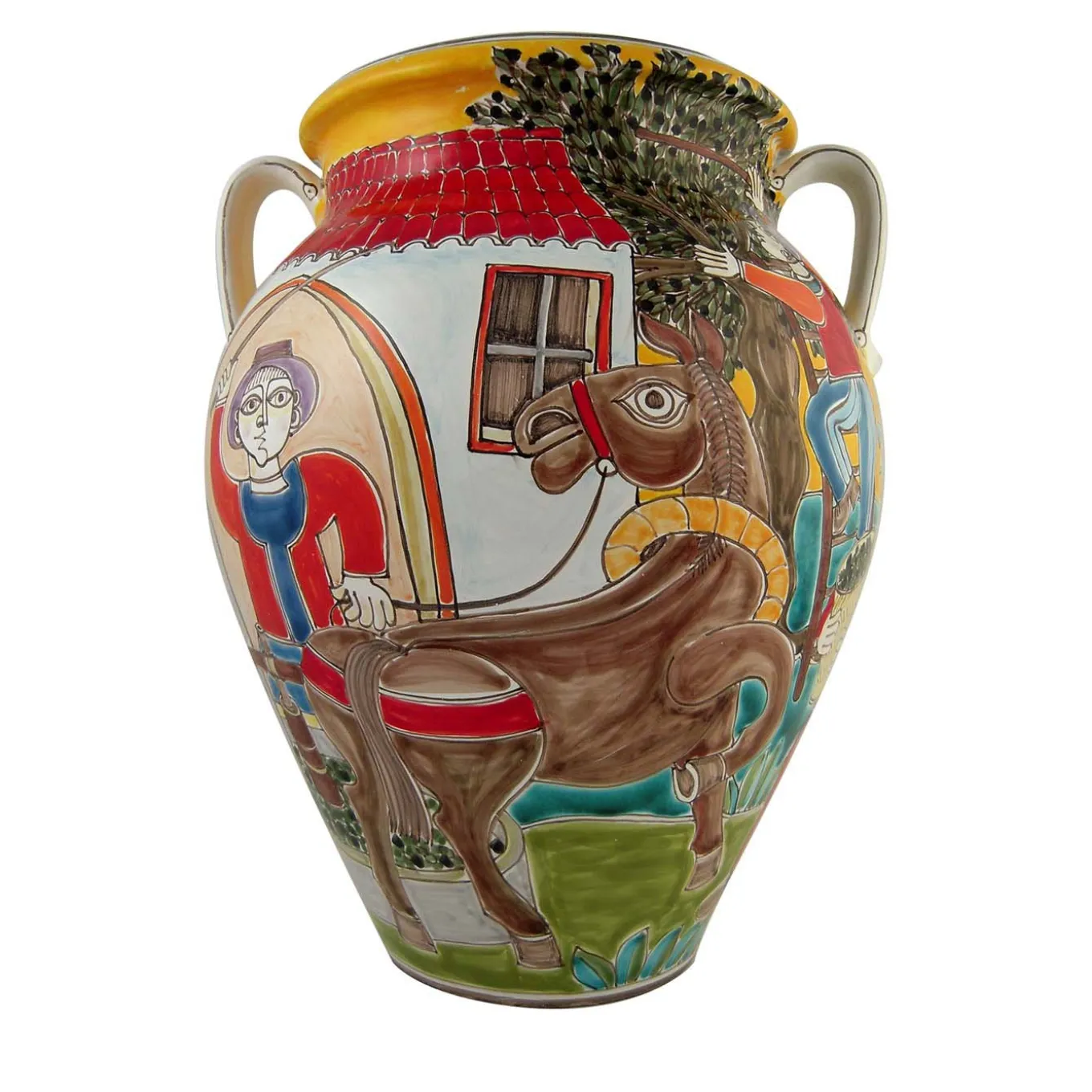 Featuring a traditional depiction of an olive harvest, this ceramic vase is crafted and painted by hand by De Simone artisans. In vibrant colors, the design is inspired by Sicily’s artistic traditions and colors, making it a perfect homage to the island’s culture. Each vase is signed and sold with a certificate of authenticity.