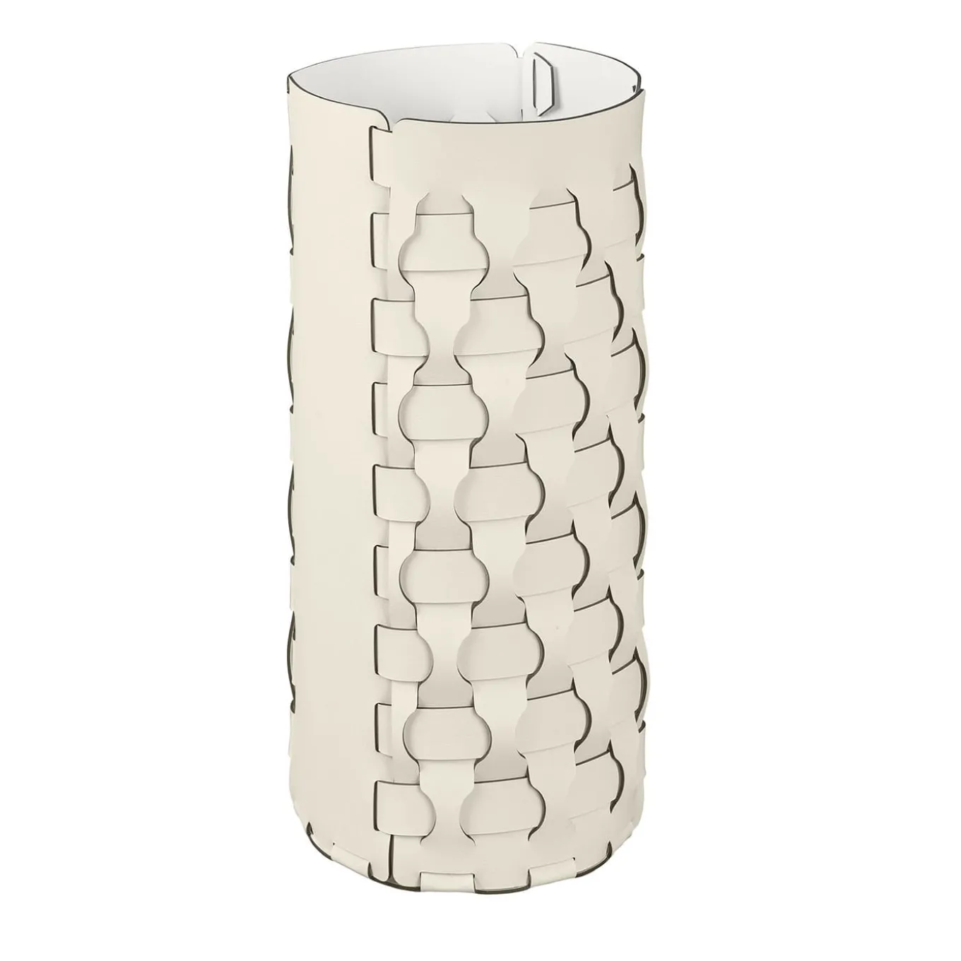 An elegant and practical umbrella stand crafted from high-quality leather, designed to be impervious to moisture and dirt. This essential household item helps maintain a clean and tidy home. Inside, it features a durable acrylic glass bucket for added convenience. The panna cotta and white umbrella stand is a stylish addition to any entryway or hallway.