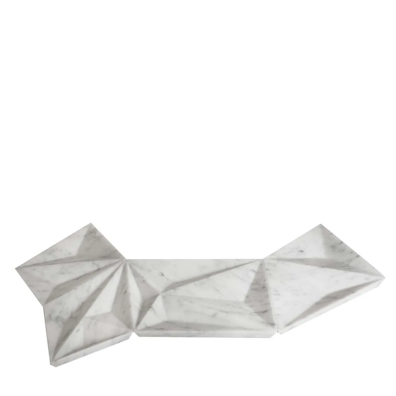 This glamorous centerpiece comprises four trays ranging in size, from small to extra-large (28x18xH3 cm, 32x21xH3 cm, 134x25xH3 cm, and 138x25xH3 cm, weighing 3, 3, 4.6, and 6.3 kg, respectively). Made of white Carrara marble with its typical light gray streaks, these angular dunes with carved lines can be arranged in endless variations, thus creating new and fascinating decors.