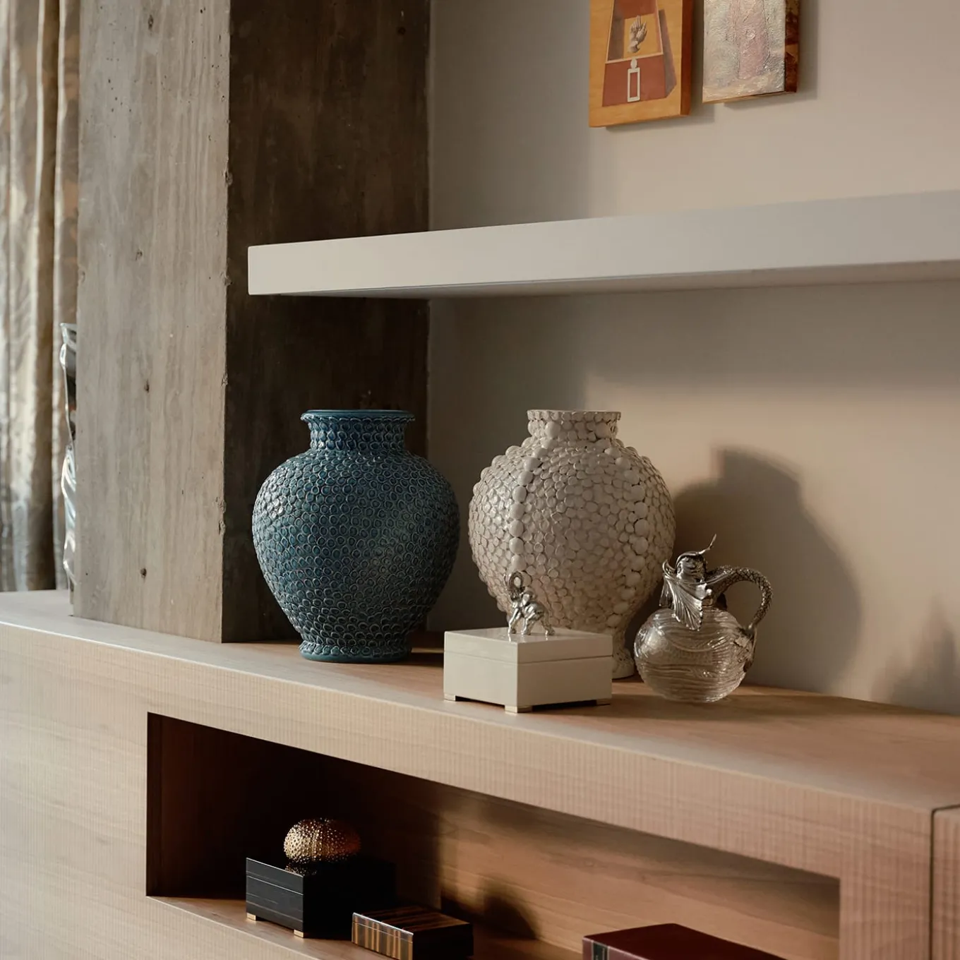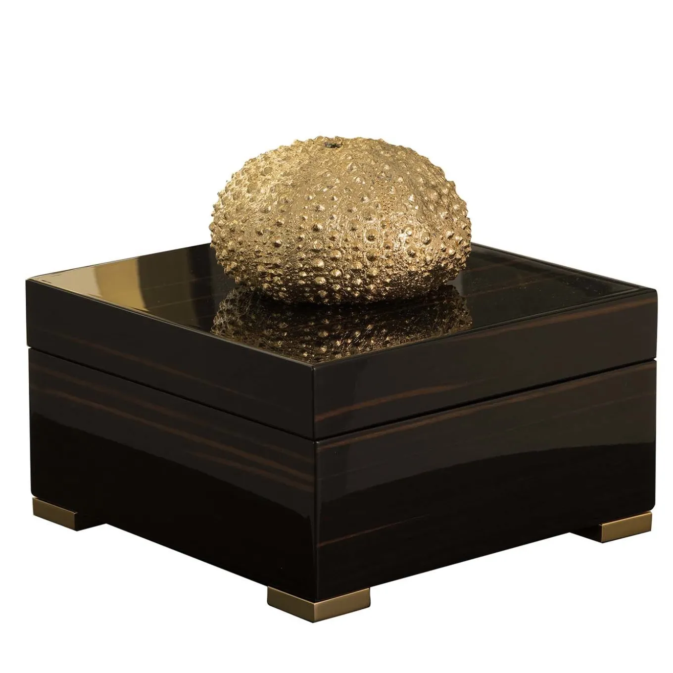 A refined accent in both modern and classic decors, this box can be displayed in any room in the house as a purely decorative object or to store small trinkets. Combining a simple silhouette with prized materials, the square frame of Macassar ebony features a lid topped with an exquisitely detailed sculpture of a sea urchin skeleton hand-forged of 24k gold-plated brass. Four small square gilded feet and a soft eco-leather lining complete this sophisticated box that will be the perfect choice for any gift giving occasion.