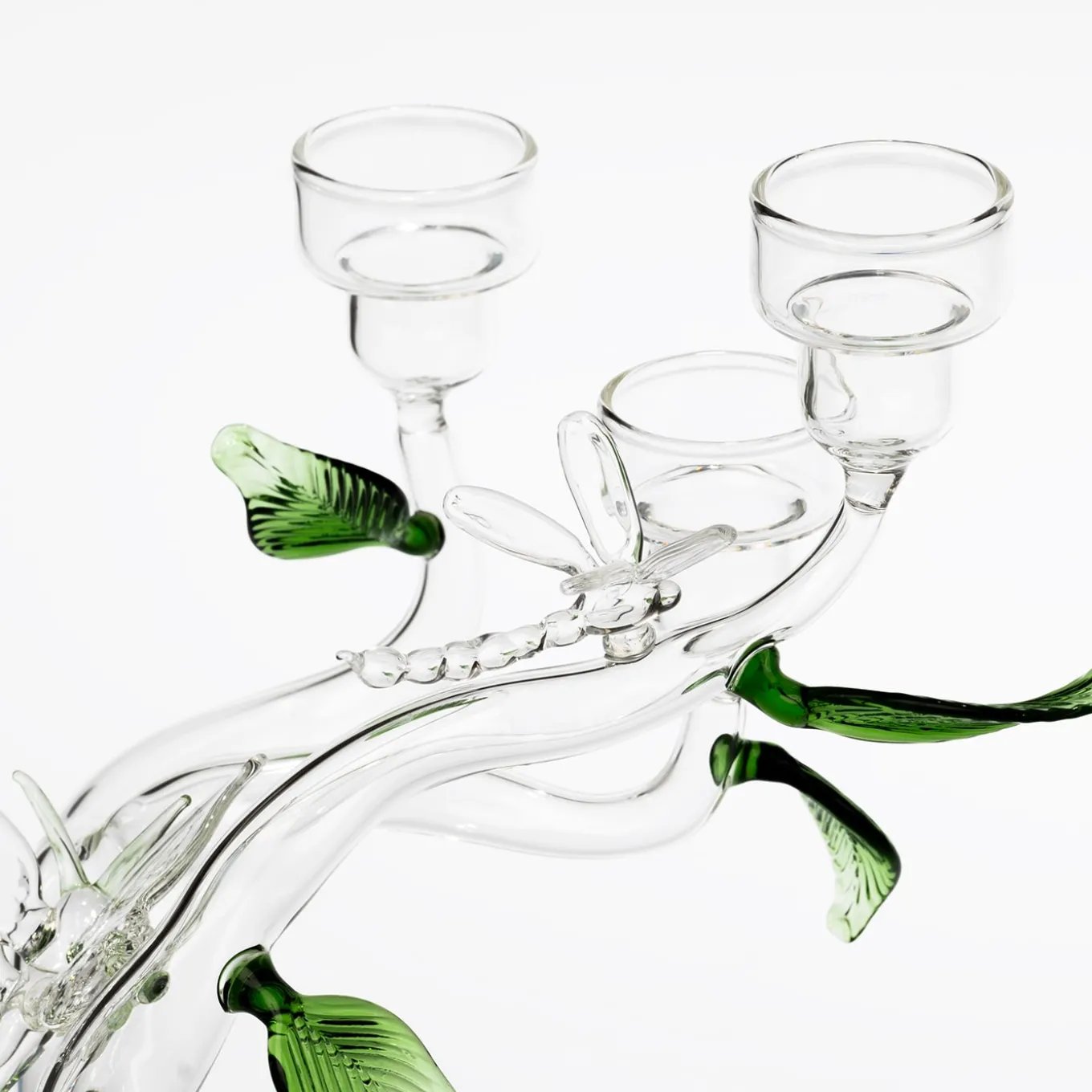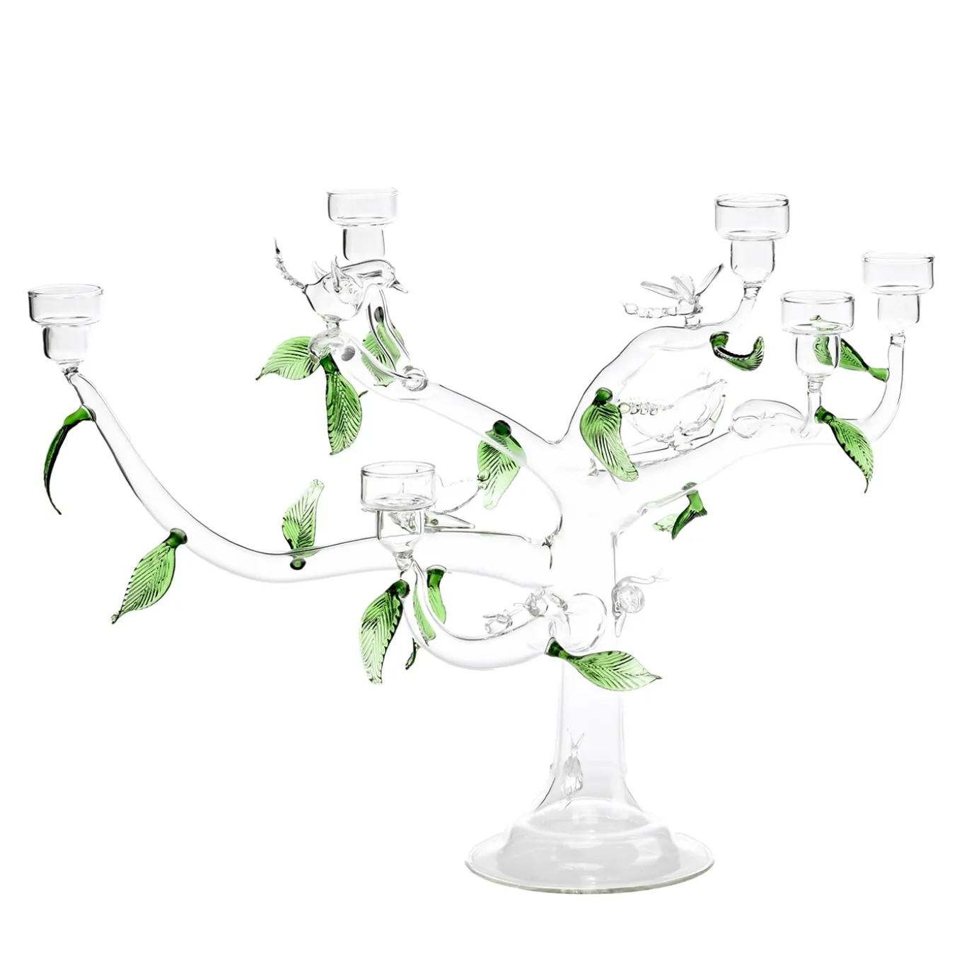 This handcrafted glass candleholder, made in Venice, resembles a transparent tree adorned with green leaves and glass figures such as butterflies, birds, dragonflies, snails, and ladybugs. Inspired by the Garden of Earthly Paradise, it symbolizes Nature’s gifts and temptations. Designed by Catherine Urban, the Eden Candleholder can be styled with long or small candles, or a mix with flowers. Each piece is unique, crafted by Venetian artisans.
