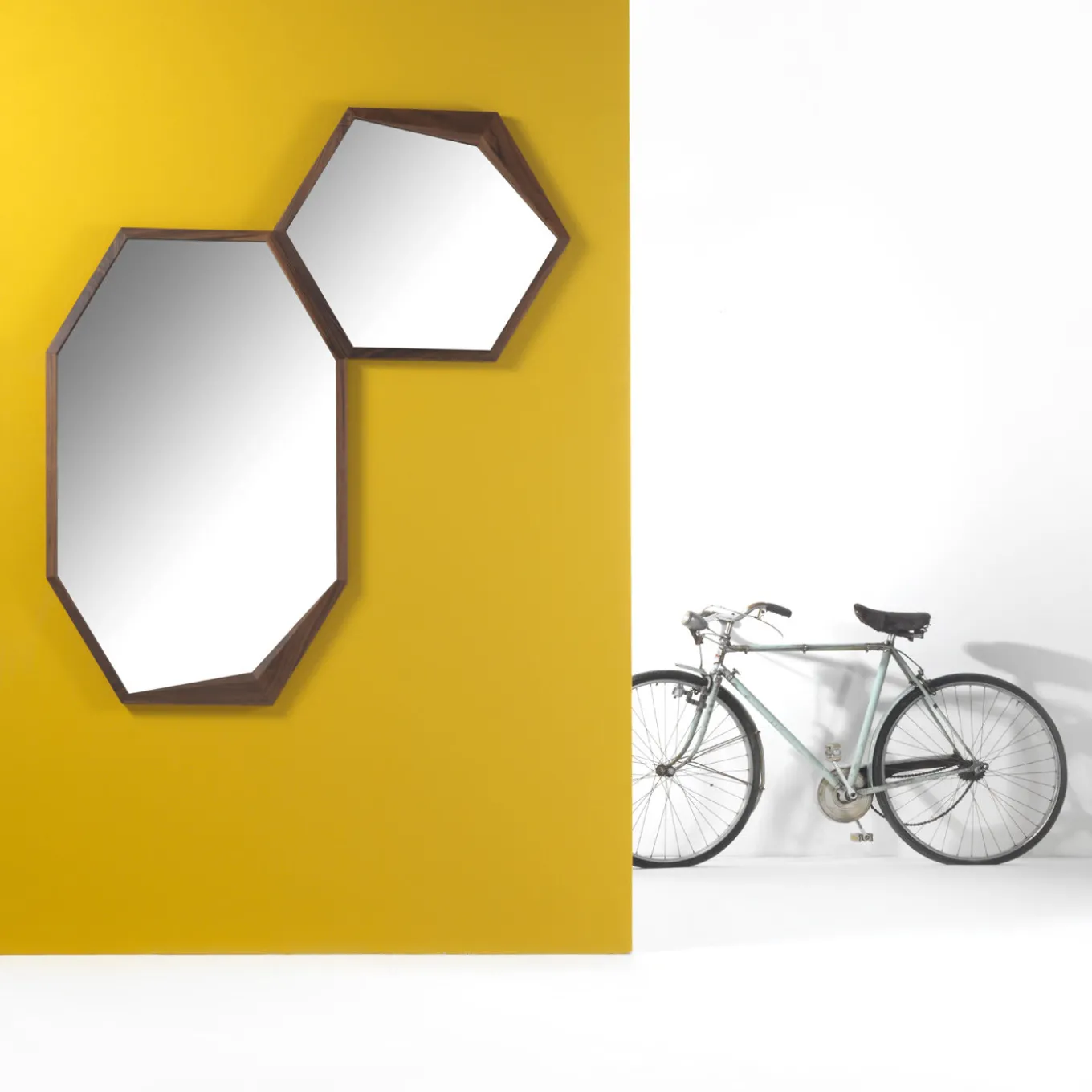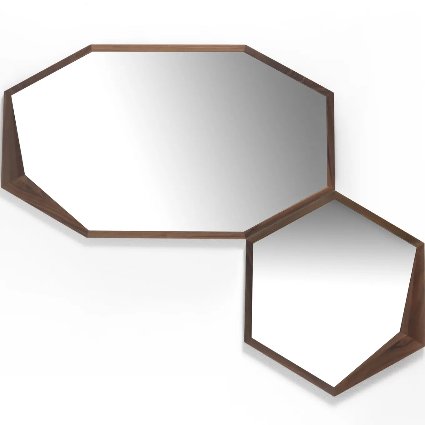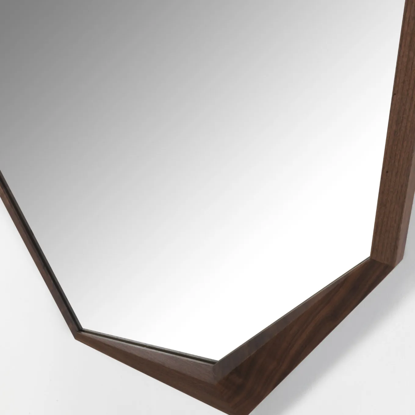 The minimalist shape of this hexagonal mirror is framed in an exquisite solid walnut structure that has a charming accent in one of its corners where the wood gets thicker, adding a modern flair to this timeless object of functional decor. A stylish addition to any home, this piece can be paired with the other Edes mirror in this collection for a dynamic look and its wooden frame can be made in solid durmast oak. Just ask the concierge for details.