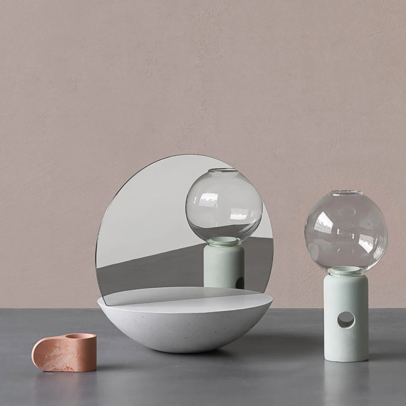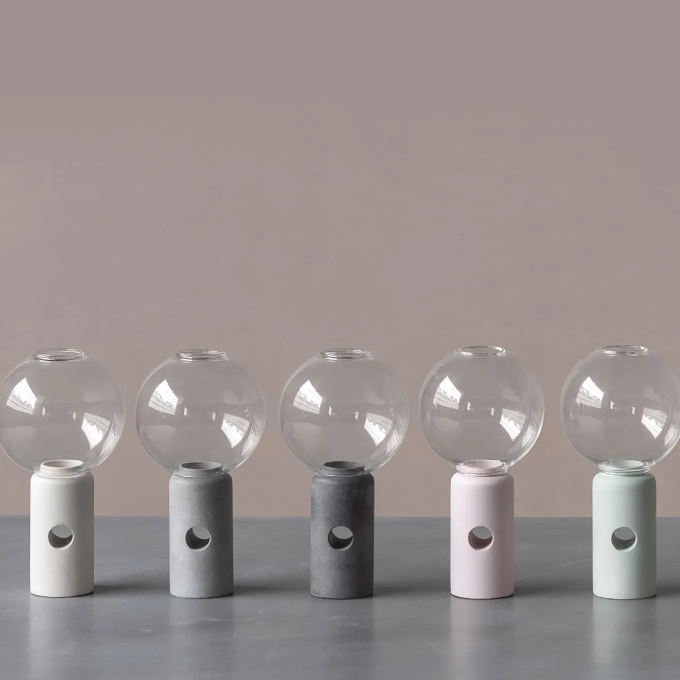 Efesto is an elegant candle holder with a concrete base available in a variety of colors and with a blown glass top. The two different materials together create a unique game of equilibrium that refers to the relationship between earth and sky, fire and water. The piece is available in different colors: salvia, silver, ardesia, white, and candy Each piece is unique, no two are the same.