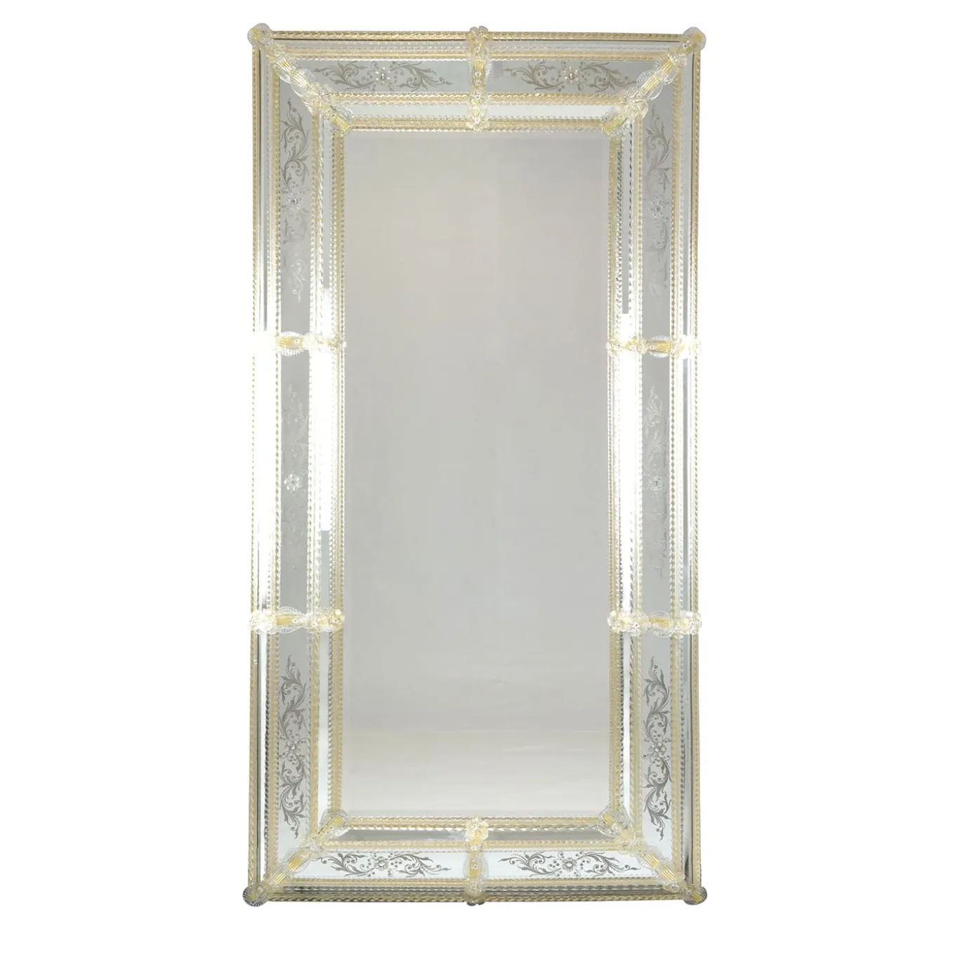 Classic rectangular Venetian mirror, made in the strictest Murano tradition with rich bands carefully engraved by hand. All assembled with golden crystal elements handmade in the Murano furnaces. Wooden frame with a natural finish. Please ask Concierge for details.