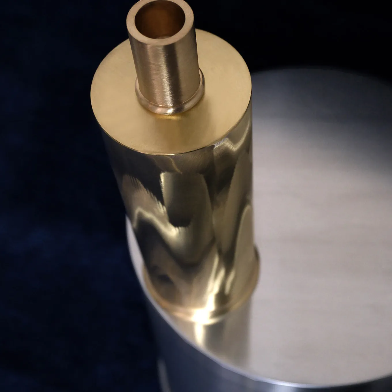 This tall candlestick holder features a sculptural silhouette inspired by the fluid texture of moiré silk. Its brushed surface and gently rounded edges create dynamic, shifting reflections that enhance its refined, contemporary character. The minimalist, elongated form suits elegant table settings and a variety of modern or classic interiors, adding a subtle yet striking glow to dining tables, shelves, or consoles. It embodies a seamless blend of functionality and artistic design. The candle is not included.