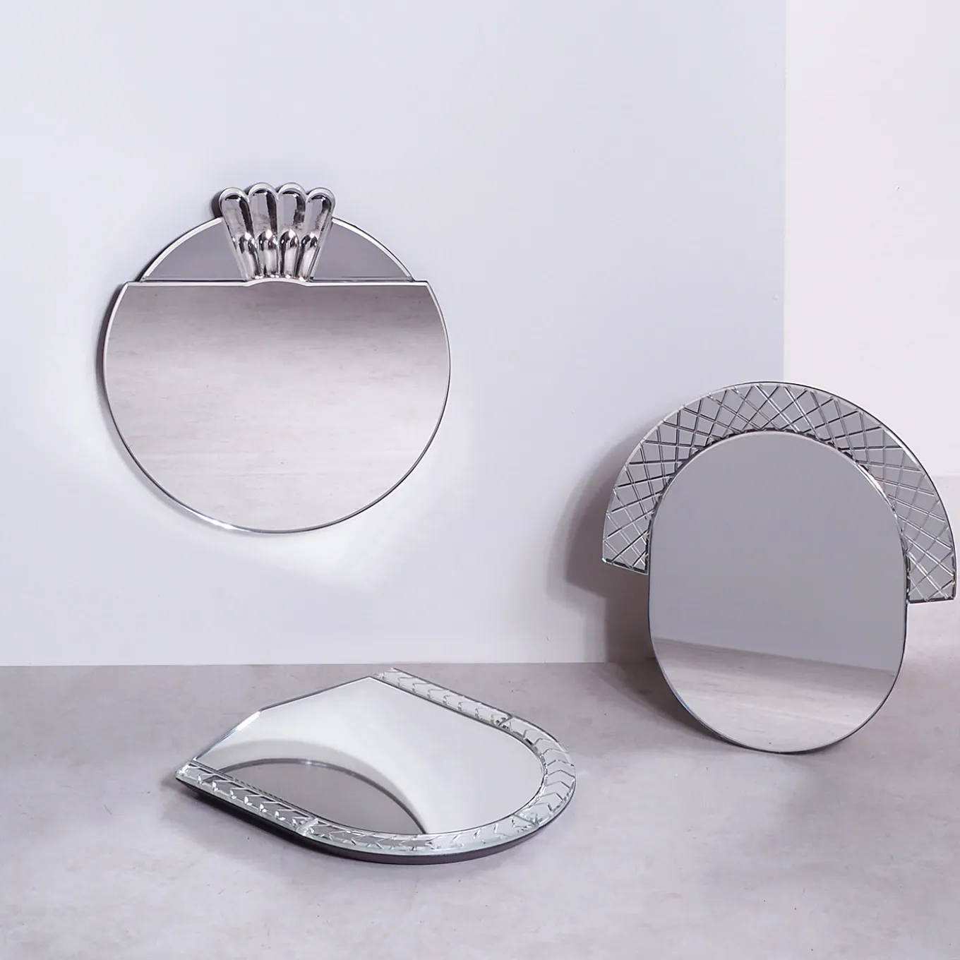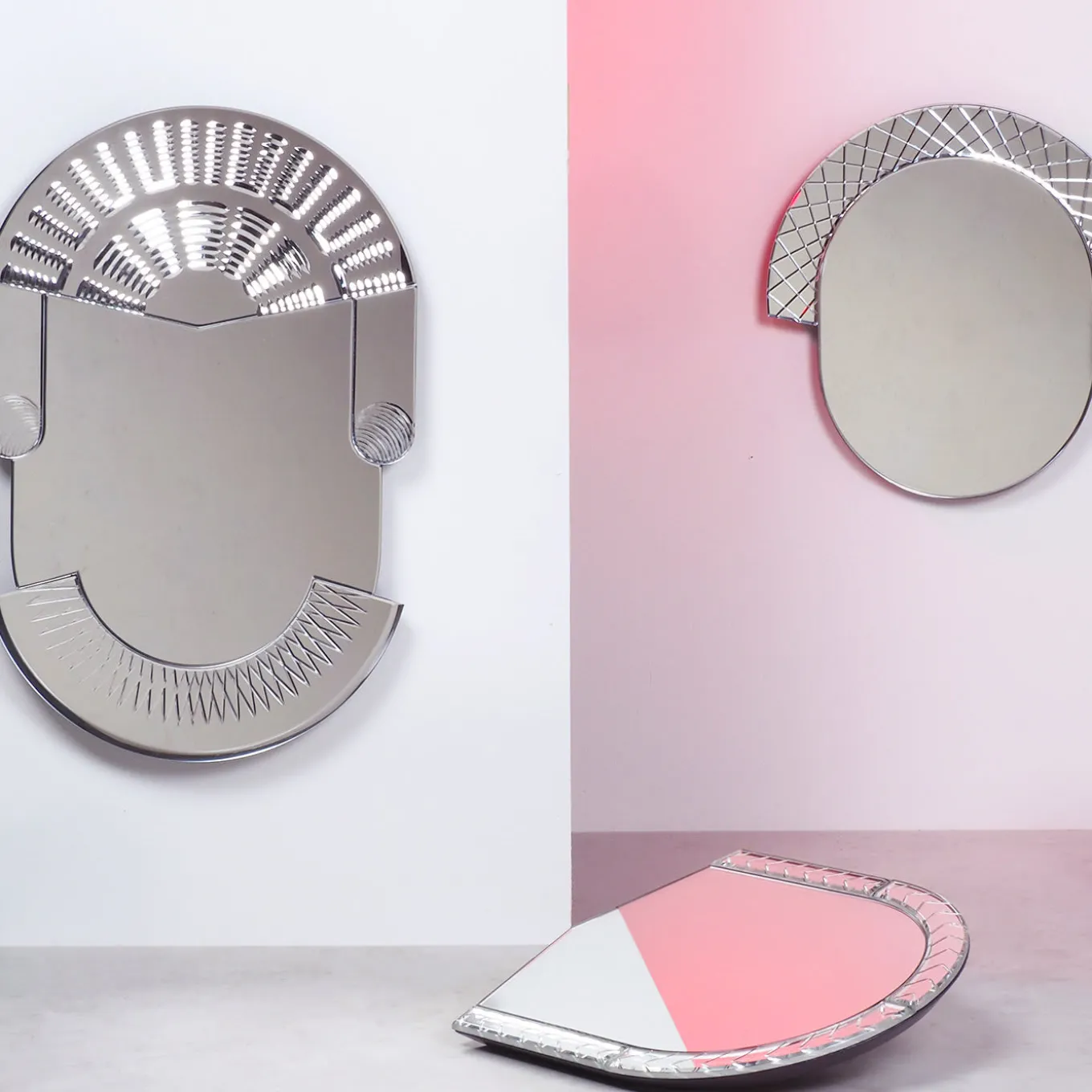 Elemento is a series of solid glass mirrors full of depth and bold graphic lines, expertly crafted by hand in Murano. This collection is the extention of the Scena collection, they take little details from that, always creating charm. Working with the skilled glass artists of Murano, a subtle use of perspective and depth was created by the intricate carving and grinding of the mirrored glass surfaces, then silvered to give depth to the details.