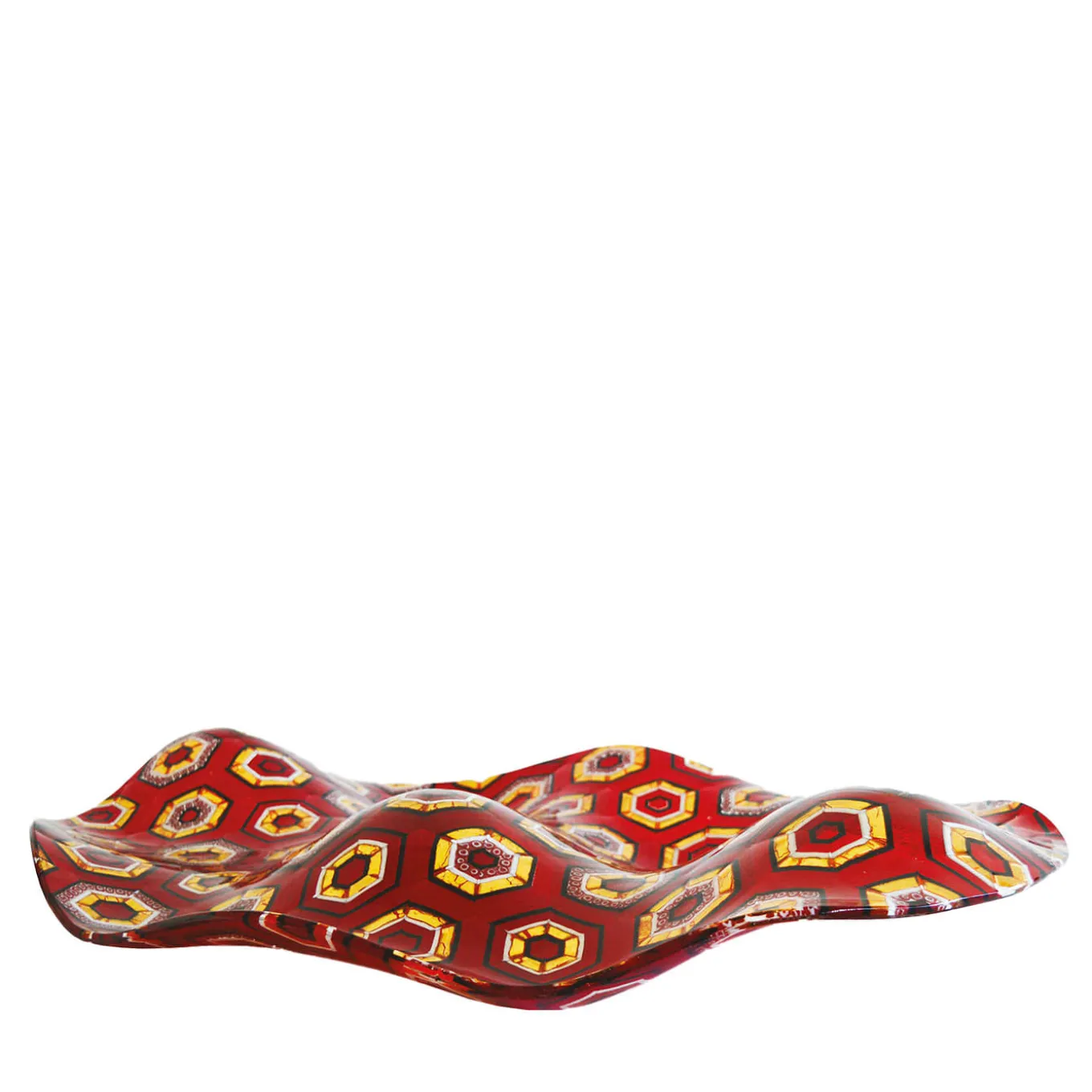 Decorative centerpiece in transparent Murano glass with an original wavy shape and large size, hexagonal decorations with gold leaf inserts. This centerpiece is an elegant object that fits well in any modern or classic interior.