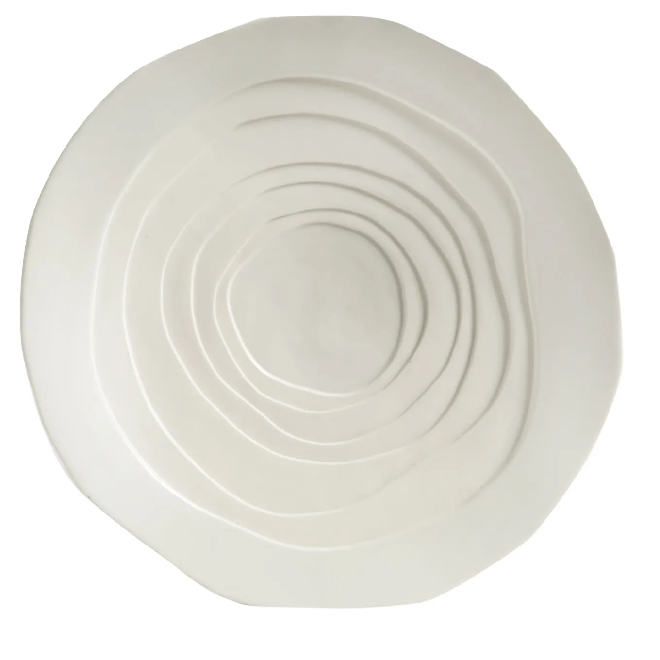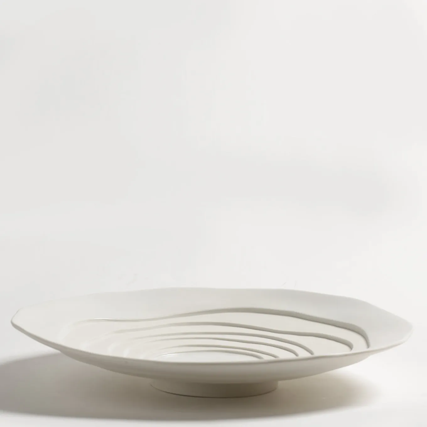 The smooth surface of this plate is interrupted by irregular ridges, like eroded rocks. Glazed surfaces contrast with the ones in biscuit, or unglazed porcelain, creating a pattern of alternating shiny and matte layers. This piece is currently on show and immediately available at Artemest Galleria New York.