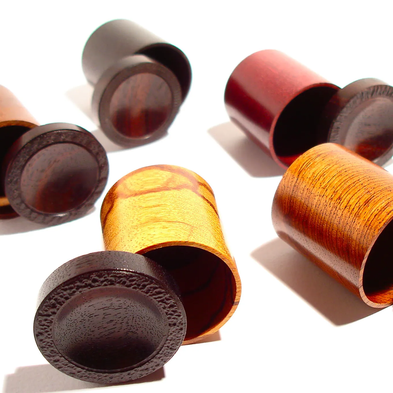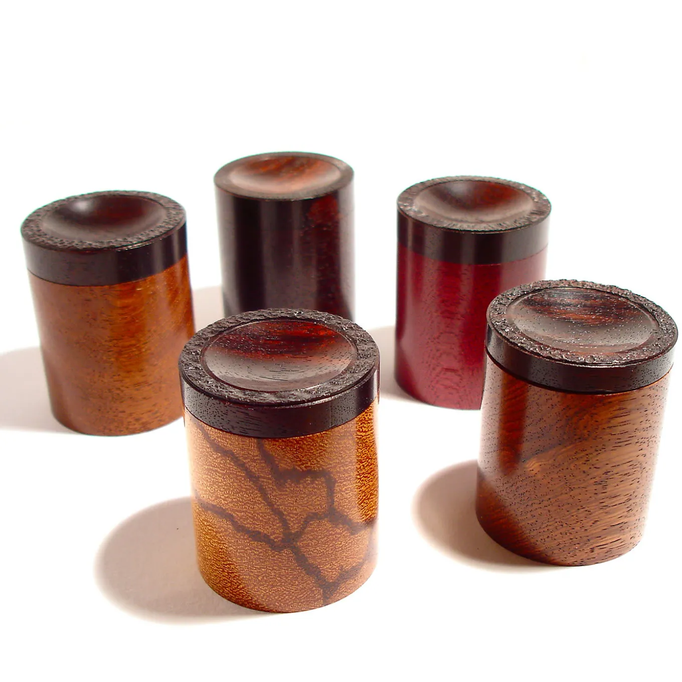 This exclusive set of the Esotico Collection includes five small boxes with lid handcrafted using six exotic, prized woods that can be used for trinkets or in a purely decorative display. The small cylindrical boxes are in Purpleheart, Teak, Wengè, Pau Ferro, Marblewood, each showcasing its distinctive grain and color, while the lids are all in Indian Rosewood with a convex center and textured rim. A high-quality oil and wax coating is applied to enhance and protect the wood.
