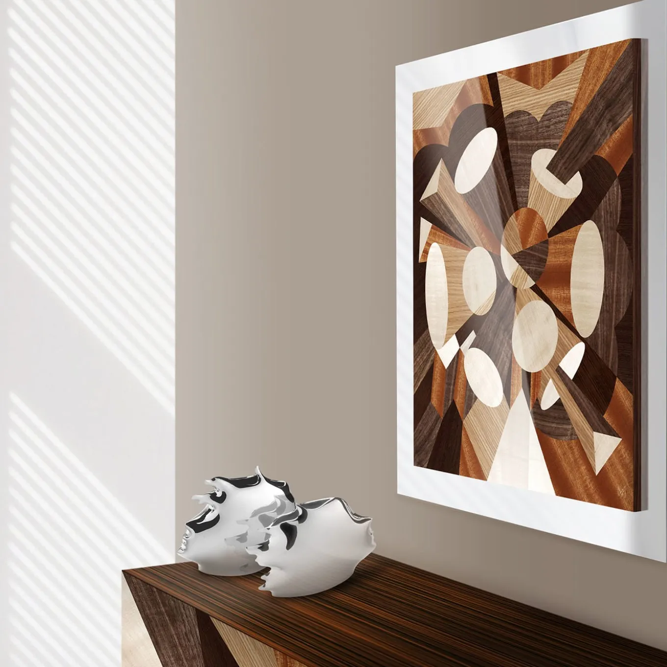 Result of the creativity and expertise of master artisans, this decorative panel is a singular objet d’art immediately capturing the eye with its explosive marquetry. Its name – explosion – is perfectly coherent with the almost centrifugal force seemingly responsible for the distribution of its precious richly contrasting inlays. A mirror-finished polished steel frame is also included.