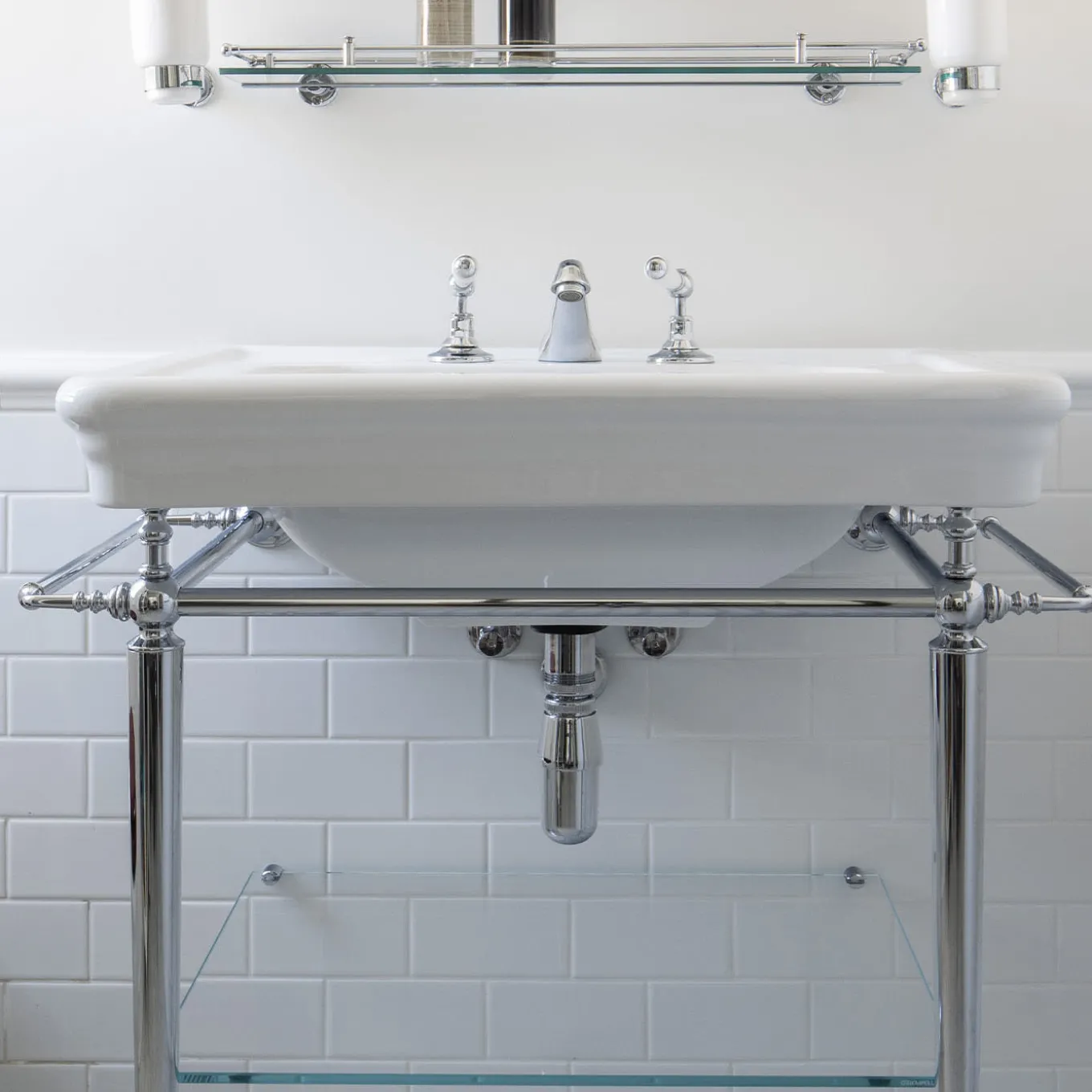 The quintessence of the classic style, conceived for the needs of space and practicality of the contemporary living. The refined English porcelain washbasin and the large glass shelf are supported by a turned brass structure in chrome finish. Faucets are not included.