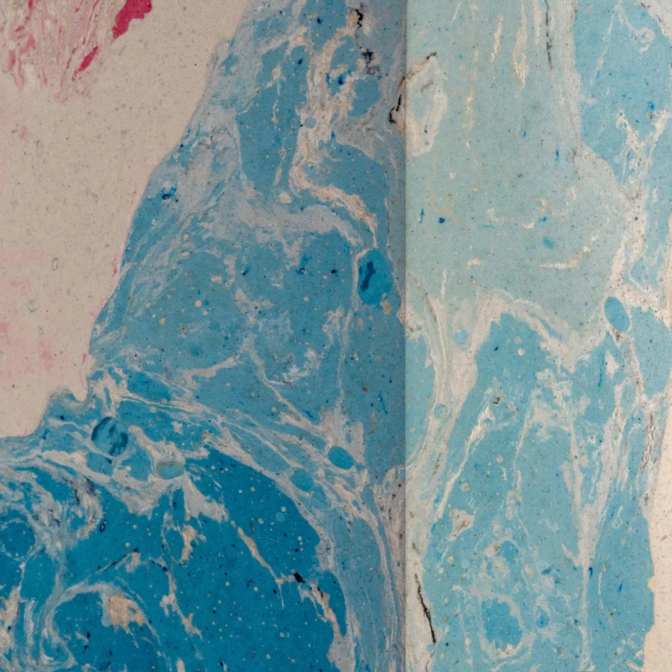 Octagonal base candelabra made of Scagliola Carpigiana. Worked with glue and natural pigments, the plaster is shaped to imitate the marble features. The candle seat is made of silver-plated brass with a diameter of 3 cm. The texture of the dough, which harkens back to sea tones following a natural gradient, provides a backdrop for pinkish and green organic spots.