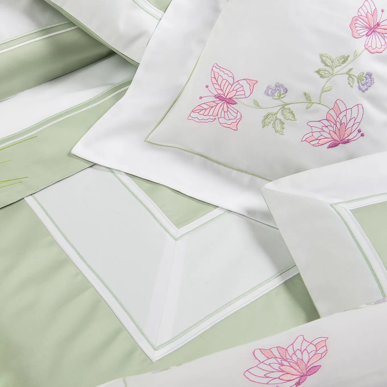This 100% cotton bedding set includes a 265x225cm duvet cover and two 50x80cm pillowcases, all crafted with 300 thread count fabric for exceptional softness. The green base is enhanced by refined satin cord and applique detailing, making it both luxurious and durable. Ideal for creating a serene, elegant bedroom, the set offers a cohesive look that harmonizes with modern and classic interiors alike.