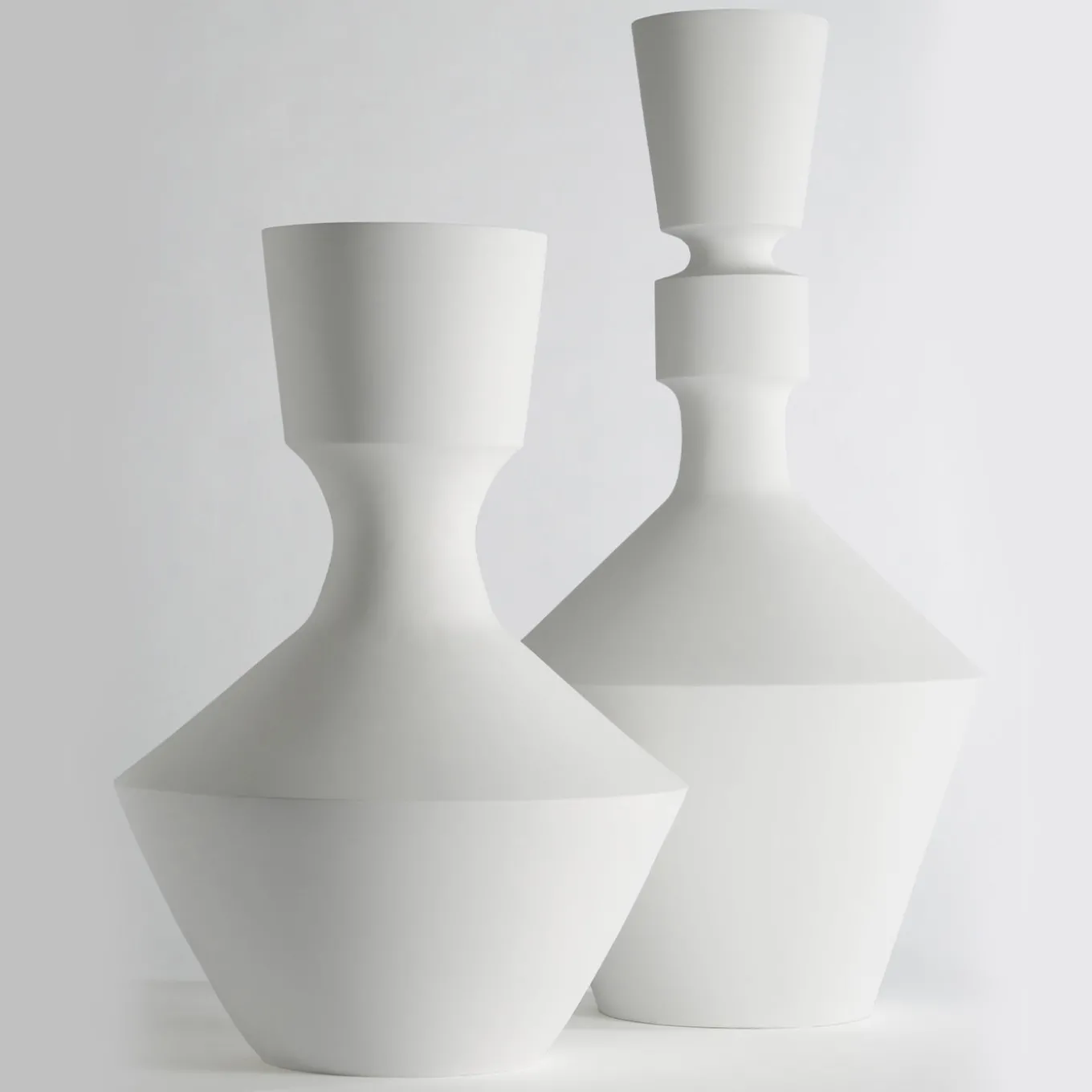 An extralarge matt white clay vase characterized by a geometric silhouette. Its bold size and minimalist finish create a striking yet understated decorative piece suitable for modern interiors. The vase’s design emphasizes clean lines and a matte texture, offering a contemporary alternative for displaying floral arrangements or as a standalone sculptural accent.