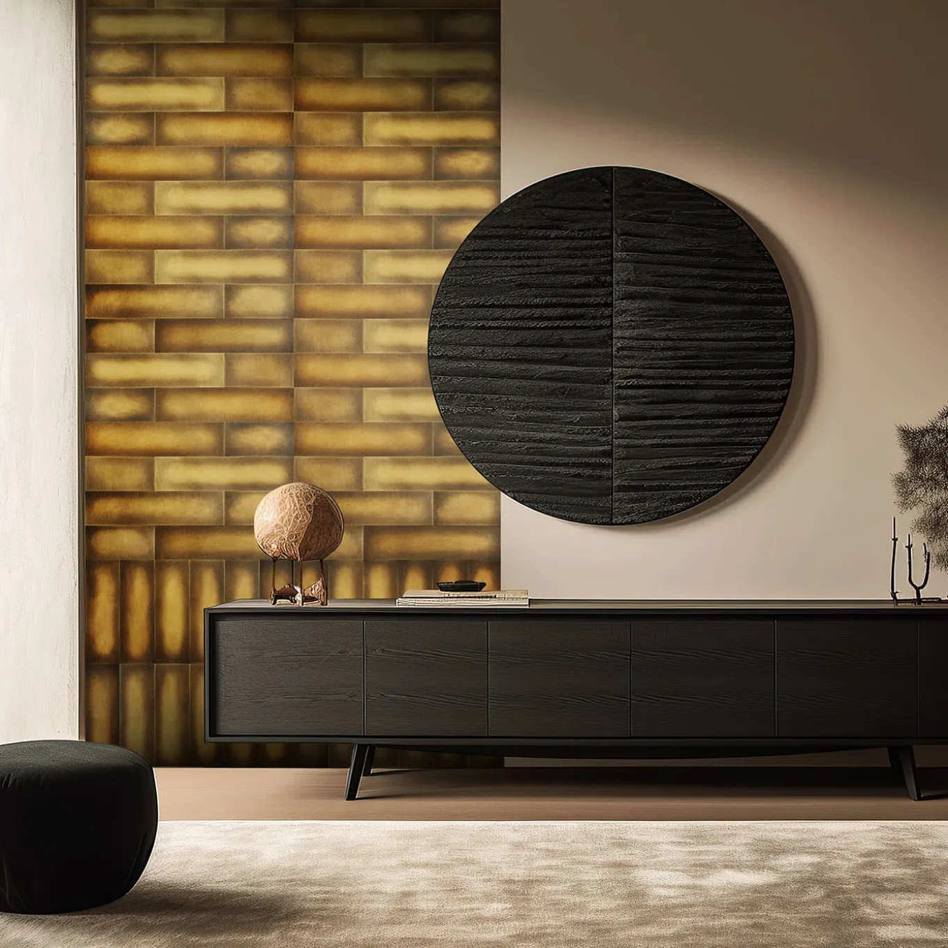 The finest Venetian artisan tradition meets geometric elegance in this precious set, counting ten hand-brushed burnished brass tiles. Distinguished by a central shaded effect, each tile exudes a sophisticated dynamism conferred by the metallic sheen as it catches the light. Please contact the Concierge for different size options. The price listed is for the set of 10 tiles. Product images show the different compositions that can be made. Contact the concierge for more information and details.