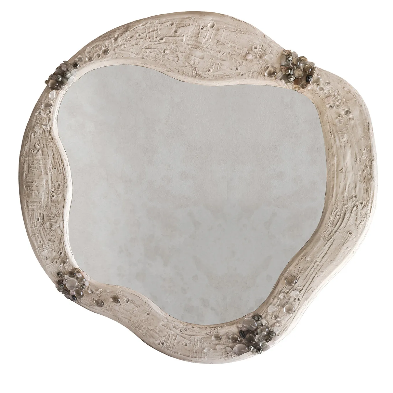 The Fairy Tale gypsum frame mirror features an irregularly shaped antique glass surface surrounded by a textured gypsum frame. The frame is adorned with clusters of natural hard stones including rock crystal, rose quartz, smoky quartz, and pyrite, adding depth and visual interest. This medium-sized wall mirror combines rustic charm with subtle elegance, making it a distinctive decorative element for various interior styles.