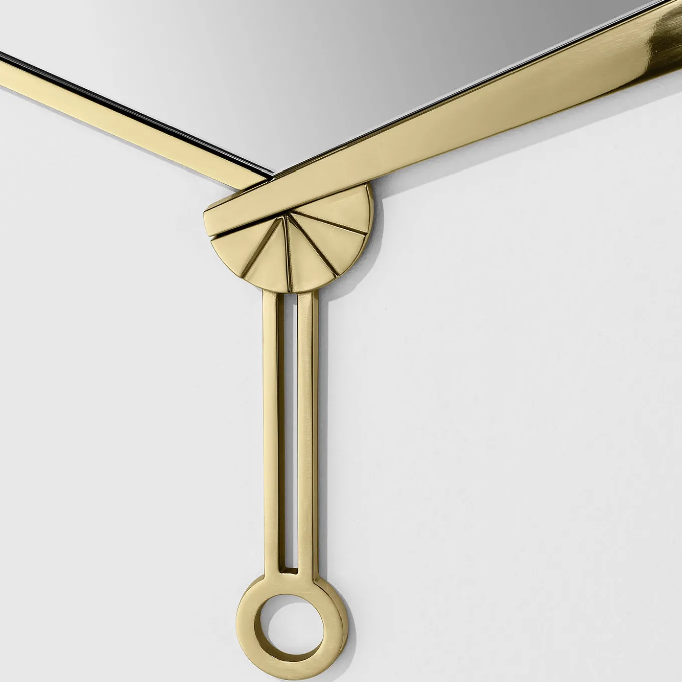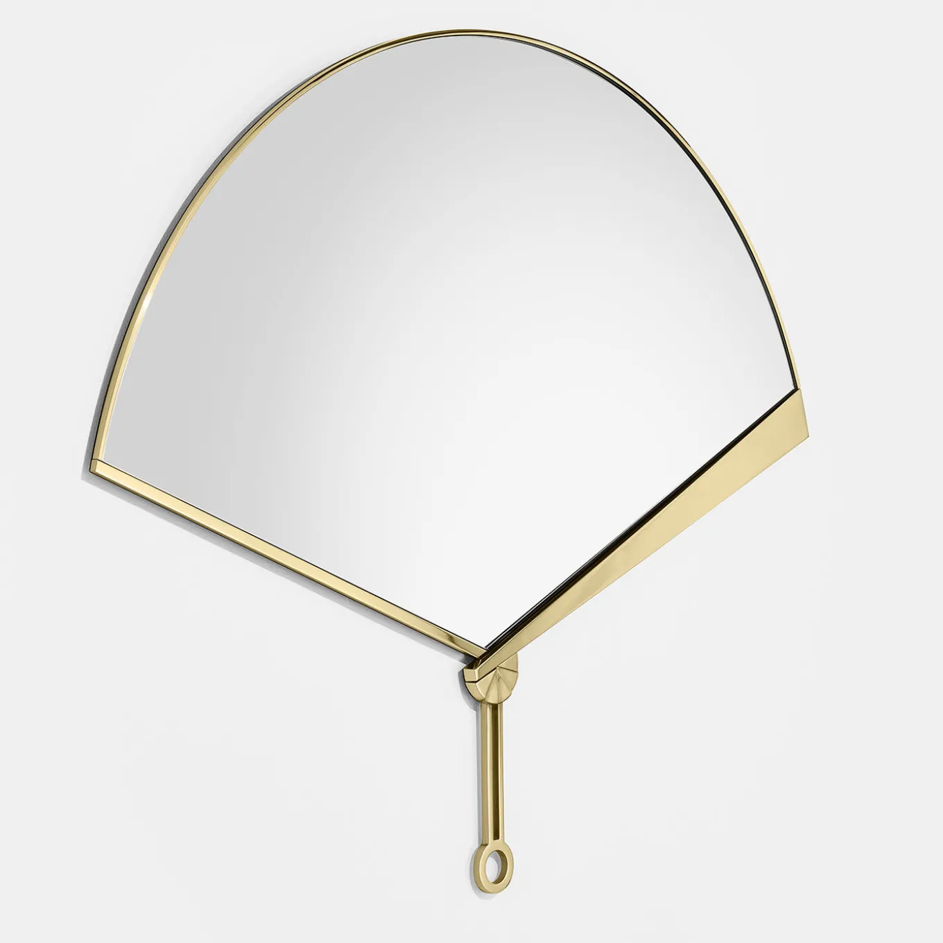This wall mirror is inspired by the iconic shape of the classic Japanese hand. Historically, the fan was used to produce a cooling breeze, as well as to create a separation between two people by hiding the face out of shyness. This minimalist object ironically subverts that tradition by reflecting back and revealing one’s image to the entire room.